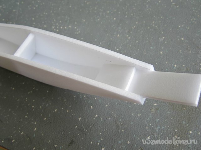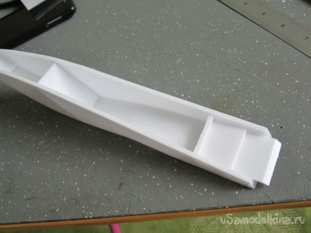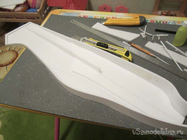 Склеиваю парочку пластин поточной плитки в торец. Вырезаю парочку боковин фюзеляжа. На переднюю часть приклеиваю второй слой потолочной плитки для укрепления, в районе моторамы и крыльев. Затем приклеиваю верхнюю и нижнюю пластину, а также ребро усиления в районе хвостовой части.