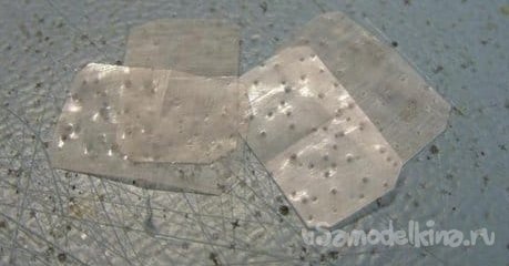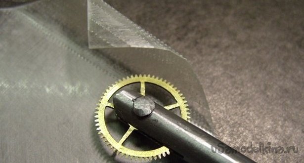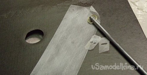 Но перед сборкой и склейкой консолей крыла. нужно изготовить петли. Для этой цели использую пластик, наклеенный на экран нового ноутбука, для защиты. С целью повышения адгезии к клею, протираю плоскость крупной шкуркой с двух сторон. Можно также проколоть отверстия иголкой. Изготовил колесико от часов на ручке. Прокатываю пластик с двух сторон. Вариантов много, можно выбрать понравившийся.