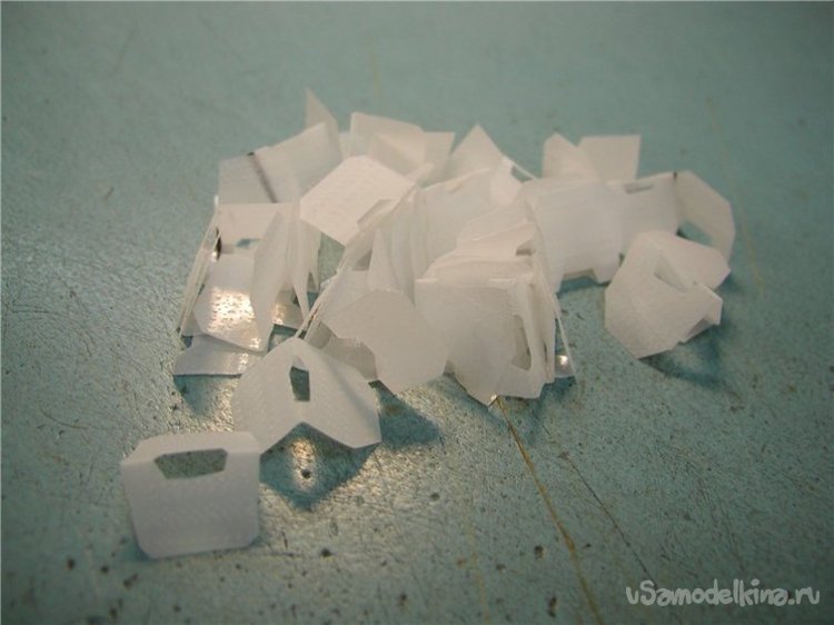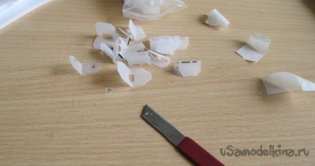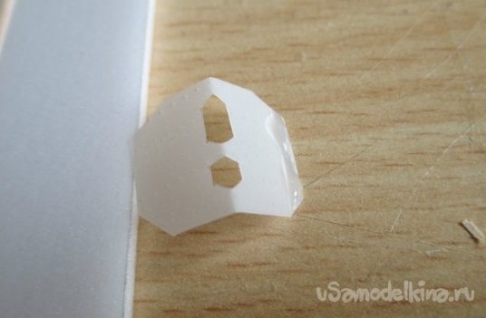 Прорезаю отверстия при помощи обломка лезвия для канцелярского ножа, заточенного с трех сторон. Для облегчения процедуры, изготовил приспособление из рекламного пластика и треугольного ножа. Так проще попасть точно в середину по толщине детали.