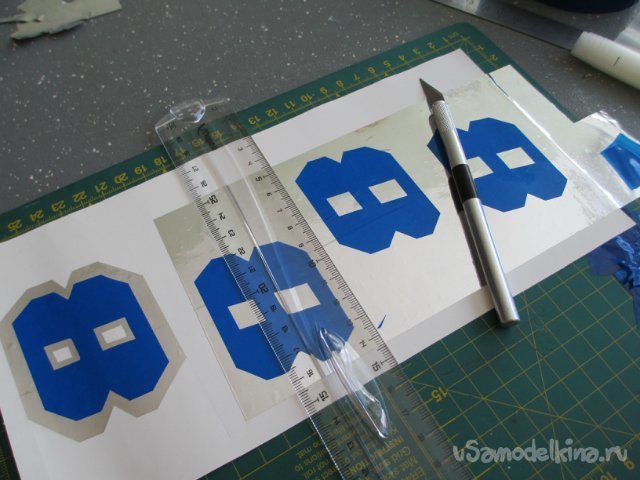 Нужно нанести бортовой номер. Вырезаю цифры из рекламной пленки, затем при помощи переносной пленки переношу их на алюминиевый скотч, обрезаю по контуру. И переношу на самолетик.