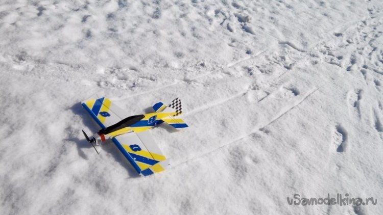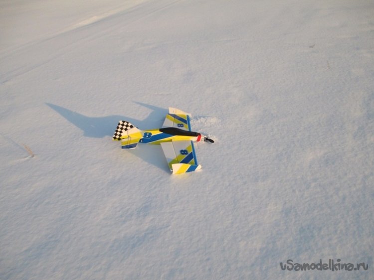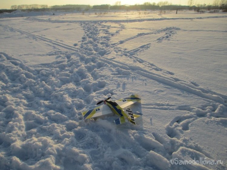 Самолетик полетел просто замечательно. Очень хорошо проводить полеты зимой. Большие сугробы спасают при некорректных посадках.