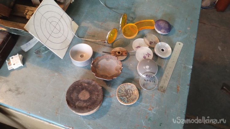Для шлифовки использовал обычный примитивный «рычажный» станок для шлифовки мелкой оптики. Обороты подобрал такие, чтобы абразивная суспензия не выливалась из шлифовальника-«чашки» центробежными силами. Это позволило установить малый «штрих» с неподвижным поводком, который имел вынос в строну от оси вращения инструмента миллиметров пять. И загружать абразив раз в пятнадцать-двадцать минут. Заготовка диаметром 46 мм. из стекла К-8 была предварительно ободрана до радиуса 78 мм с обеих сторон в форме мениска, так как впоследствии должна была стать менискообразной отрицательной линзой.