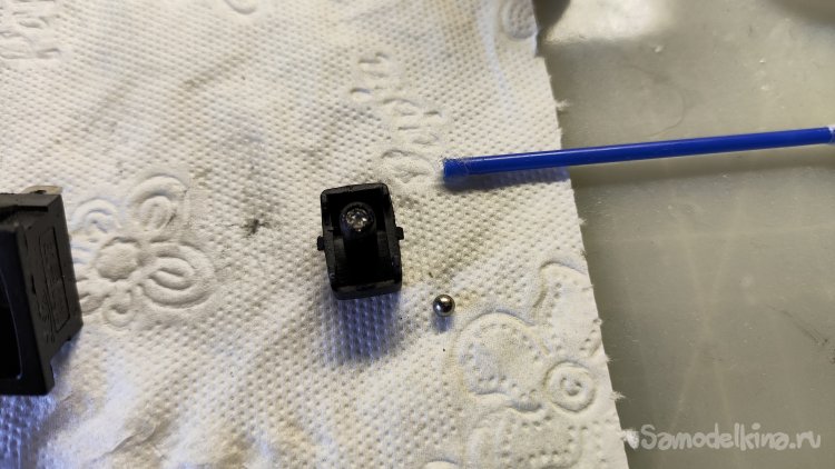 Вставляю в корпус подвижный контакт, переключатель располагаю над корпусом шариком вниз, аккуратно защелкиваю переключатель, чтобы не сорвался шарик. Проверка, выключатель работает. Поставил выключатель на место.
