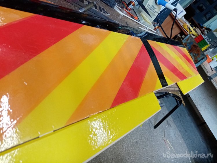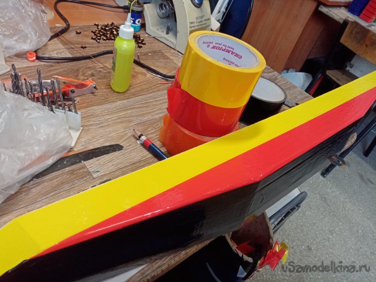 Наклеиваю скотч на подвижные части руля высоты, предварительно отклонив на значительный угол. В противном случае скотч блокирует подвижность этой детали.