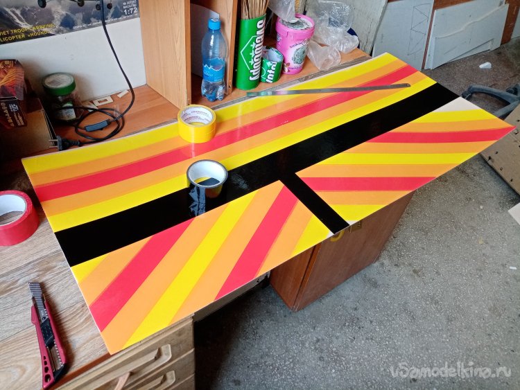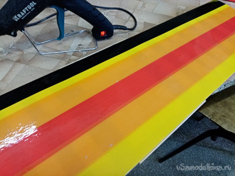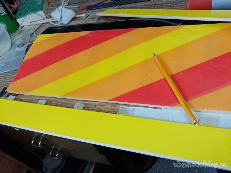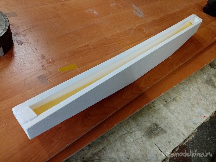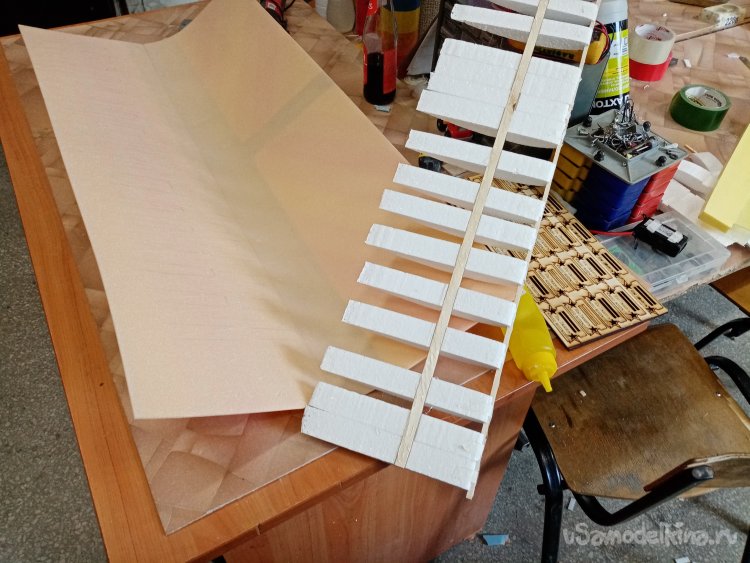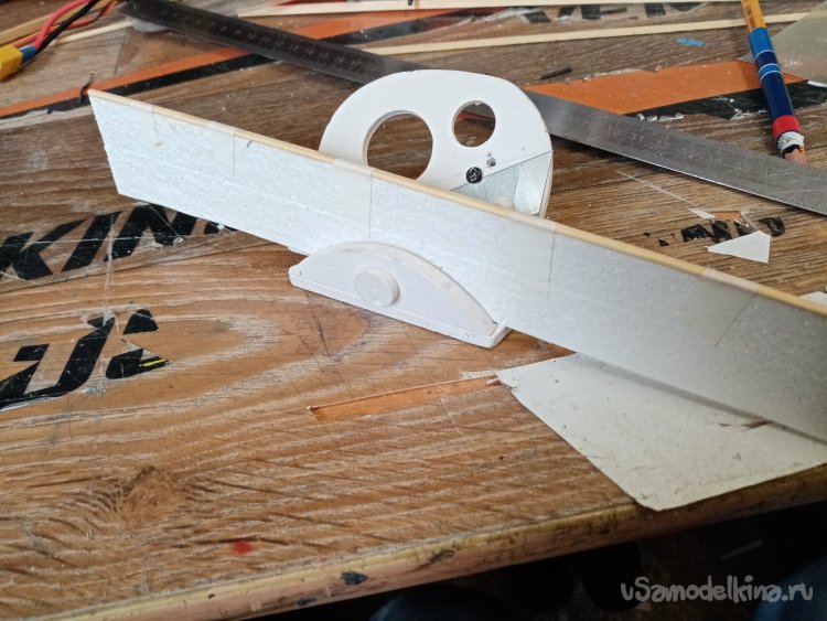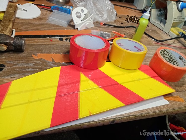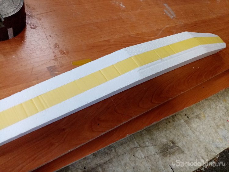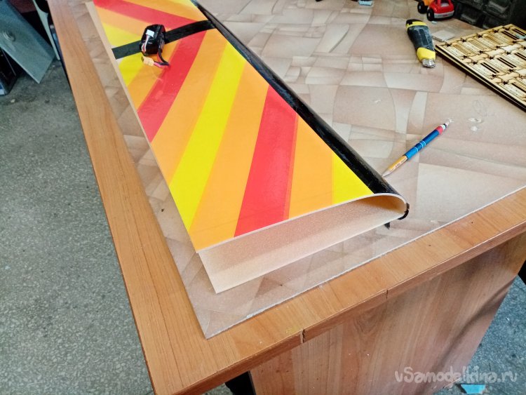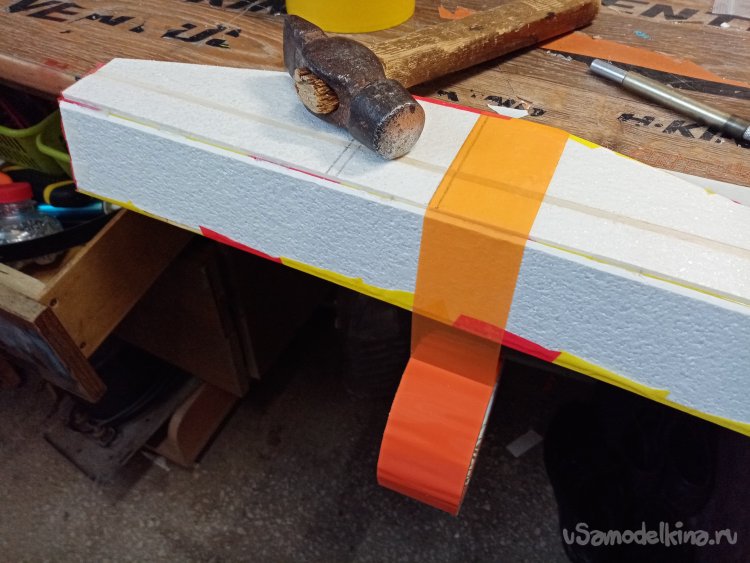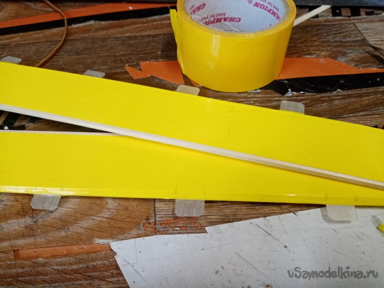 Обшивку набора крыла выполняю из подложки под ламинат толщиной в 3мм. Чтобы предотвратить растрескивание материала при изгибе, оклеиваю всю плоскость цветным упаковочным скотчем.