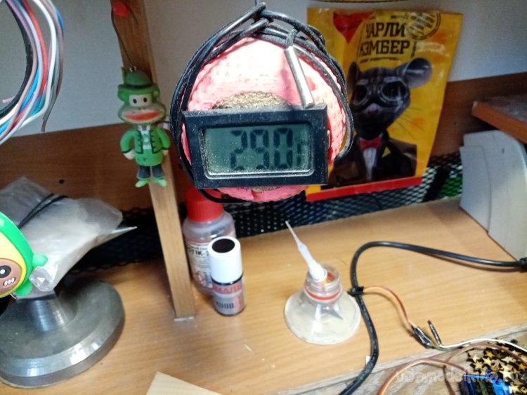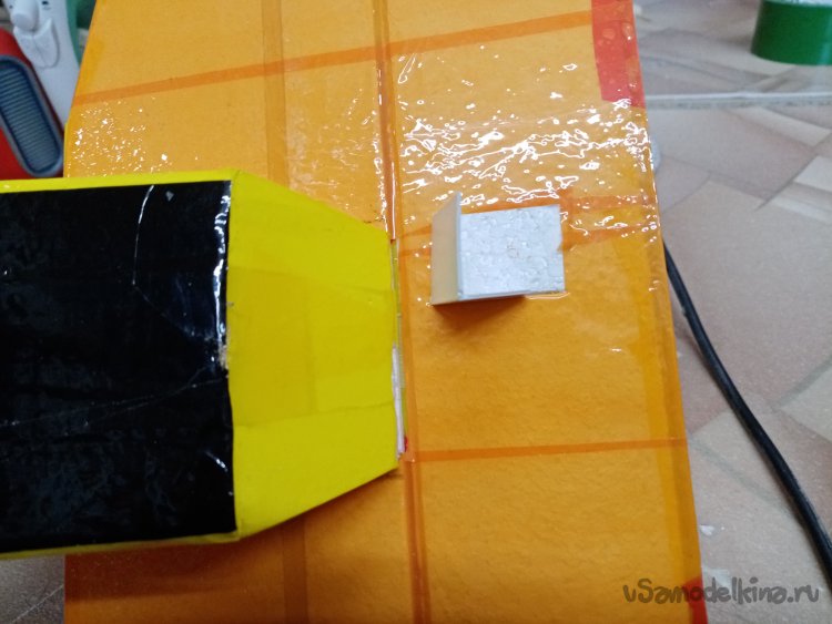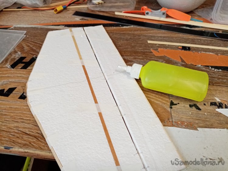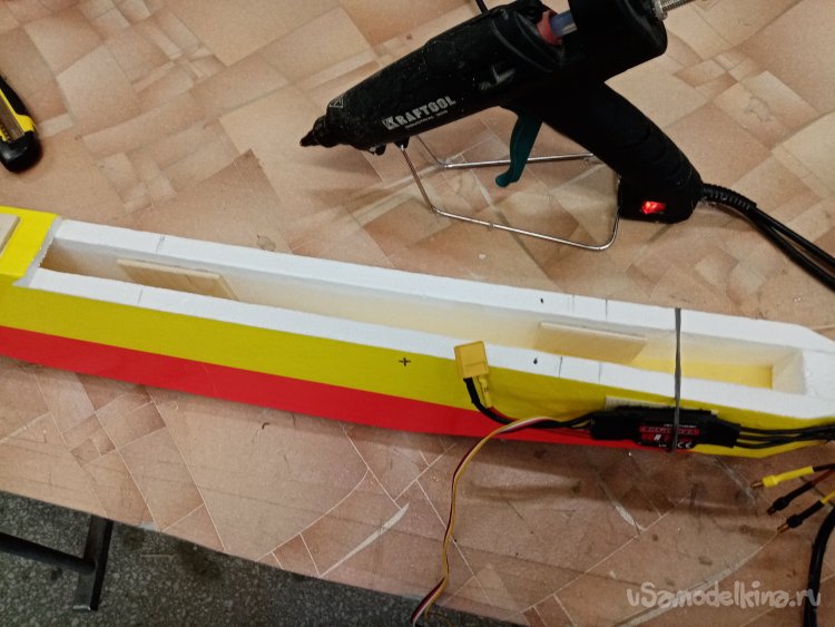 На дно вырезал заготовку из оранжевого утеплителя. Тоже из обрезков. Продолжаю экспериментировать. Поэтому бодренько собрал фюзеляж при помощи термопистолета. Но поскольку данный агрегат куплен без регулятора температуры, делаю пробные проклейки на кусочках пенопласта. Подбираю температуру таким образом, чтобы не плавил заготовки. И так, дно приклеил.