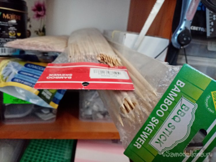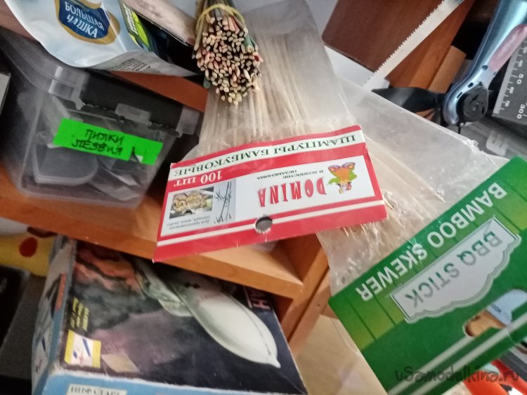 Руль направления будет выполнен одной пластиной, без подвижных частей. Подбираю нужную по размеру пластину их бракованного арсенала. В качестве усиления использую бамбуковые шпажки. Извлекаю нужное количество материала из запасников. Которые приклеиваю на переднюю и заднюю грань руля направления на титан. Все фиксирую полосками малярного скотча. Пока не отключили батареи, сохнут детали в тепле.