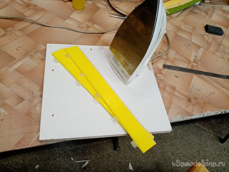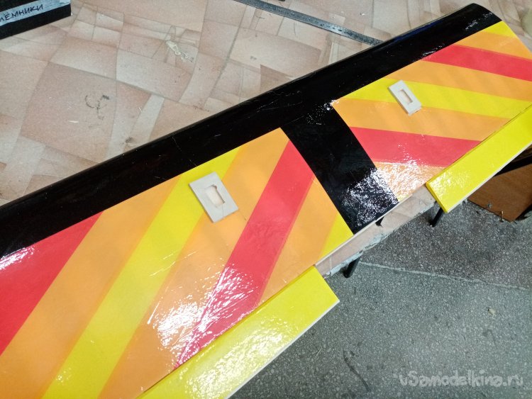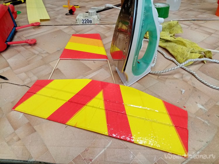 Нужно оклеить элероны скотчем для прочности. Немного шлифую поверхность наждачкой. Протираю от пыли влажной тряпочкой. И оклеиваю желтым скотчем. Для надежности поглаживаю, все оклеенные поверхности крыла, фюзеляжа и элеронов утюгом. Предварительно подобрав температуру. Таким приемом лучше привариваю пленку к пенопласту.