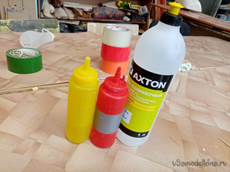 На противоположную грань заготовки наклеиваю на титан рейки усиления и фиксирую малярным скотчем до полного высыхания. В этом случае пользуюсь маленьким флакончиком клея.