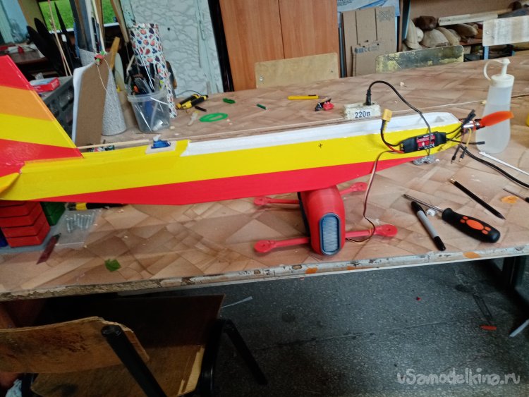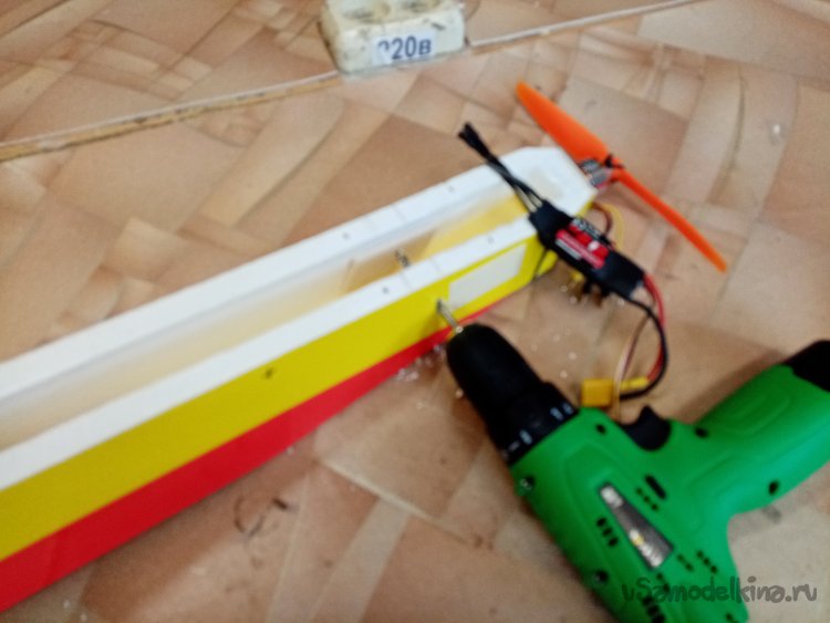Затем приклеиваю мотораму на торец фюзеляжа при помощи термоклея. Буду надеяться, что склейка будет надежная.