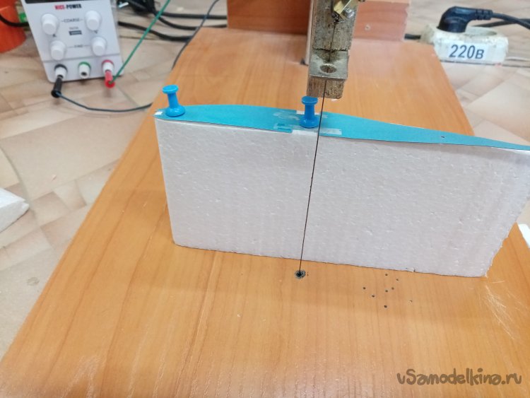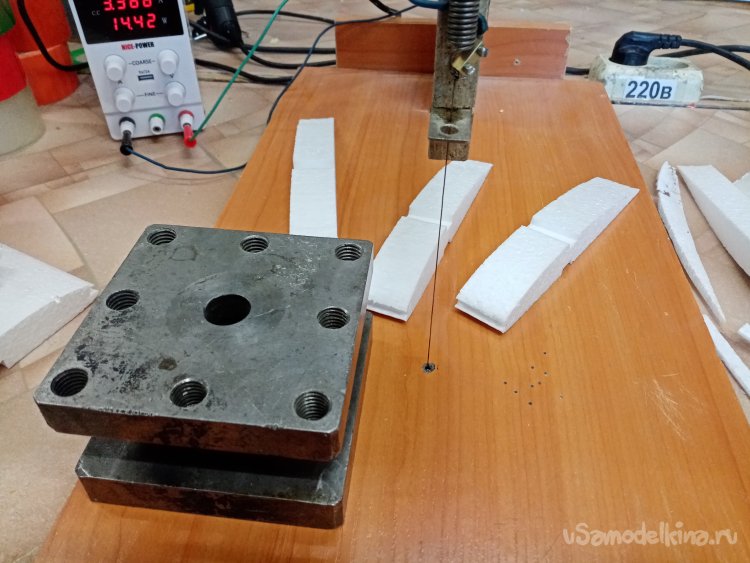 Из обрезков пенопласта при помощи шаблонов и вертикального станка вырезаю заготовки нервюр. В этом варианте решил вырезать из толстой заготовки. Основная трудность обеспечить вертикальность реза раскаленной проволокой. Хотя есть у нас и станок ЧПУ для резки пенопластовых крыльев, решил попрактиковаться просто ручками. Нарезал значительное количество толстых заготовок. Затем разрезаю но нервюры. Для крыла размахом в метр нужно 21 штука.