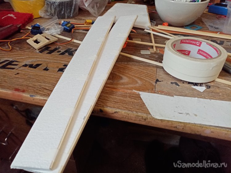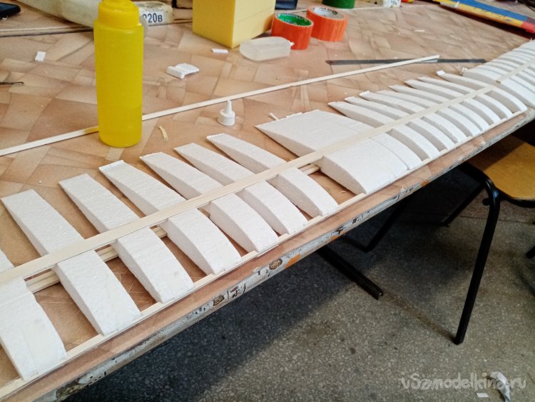 В качестве лонжеронов использую деревянную рейку. Размечаю расположение нервюр. В средней части нужно установить некоторое количество. Укрепить, поскольку буду крепить крыло к фюзеляжу на резинках. Сначала приклеиваю нервюры к нижнему лонжерону, при помощи термопистолета. После установки всех элементов закрепляю верхний лонжерон. После приклеиваю на титане переднюю кромку и фиксирую её при помощи малярного скотча. Его можно не снимать поле установки обшивка. Прочнее будет.
