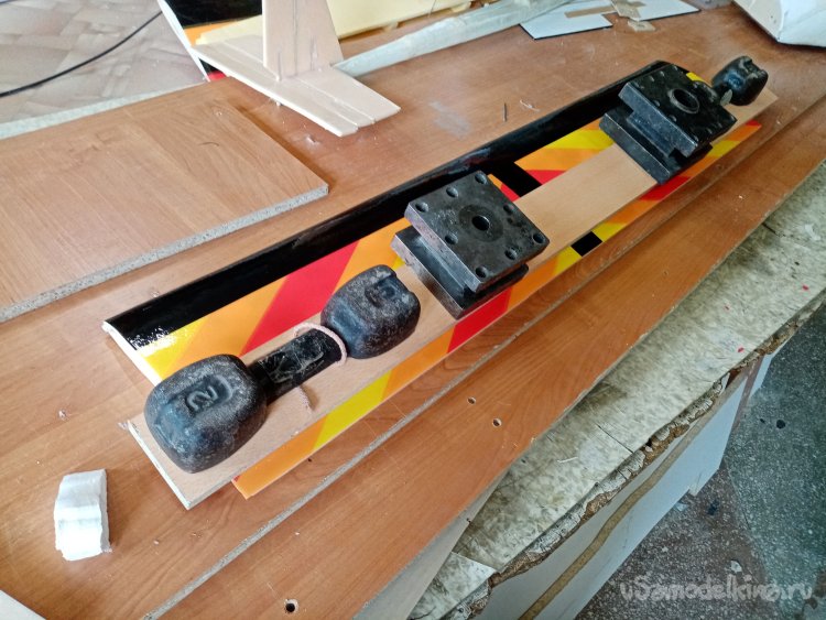 Наношу титан на нижнюю часть набора и обшивки. В этом случае как раз подходит к работе большая бутылка с клеем «горчитса». Выждав некоторое время для загустения клея. Устанавливаю набор на нижнюю часть обшивки по разметке. Прижав немного набор по месту, продолжаю. Теперь наношу клей на верхнюю часть набора крыла и обшивки. Аккуратно закрываю крыло. Всю конструкцию прижимаю грузами, до следующего дня. Клей плохо сохнет в закрытой части.