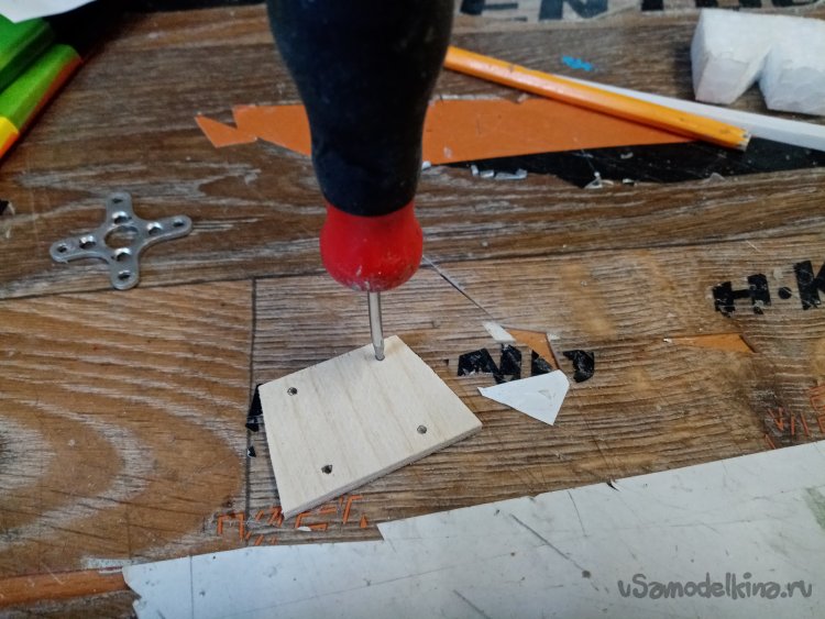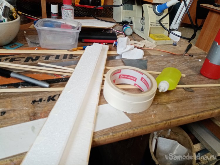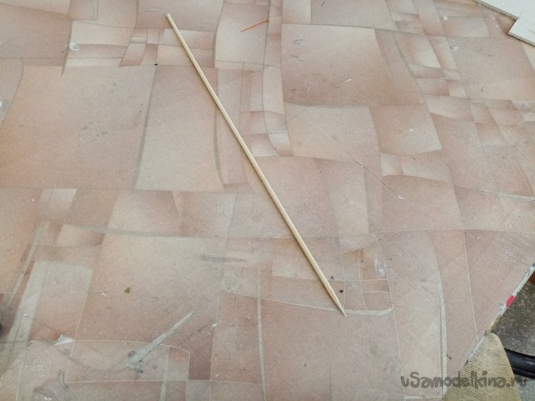 Следующим этапом изготовление руля высоты. Заглядываю в коробочку с обрезками. Подобрал нужный размер, обрезал. От заготовки отрезаю подвижную часть руля высоты. На заднюю кромку приклеиваю шпажку усиления. Деревяшку приготовил из салфетки на стол. Разобрал на палочки.