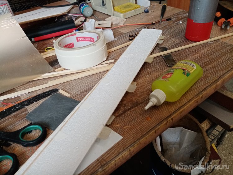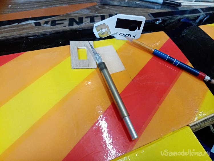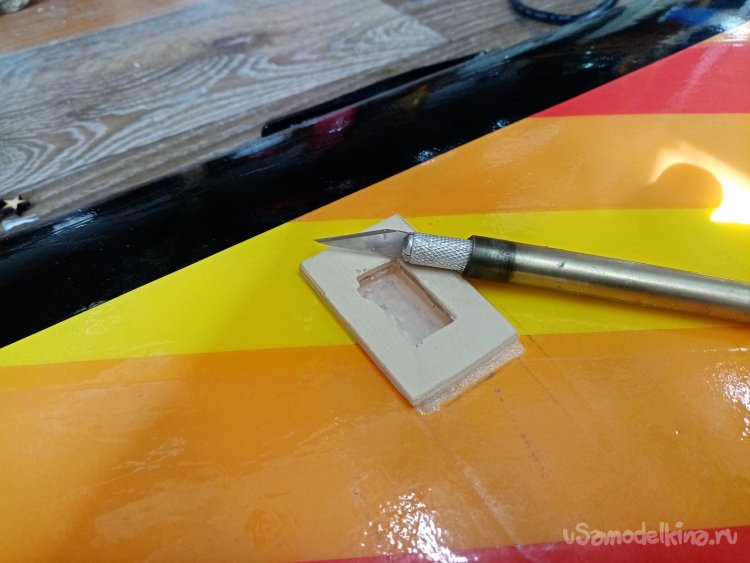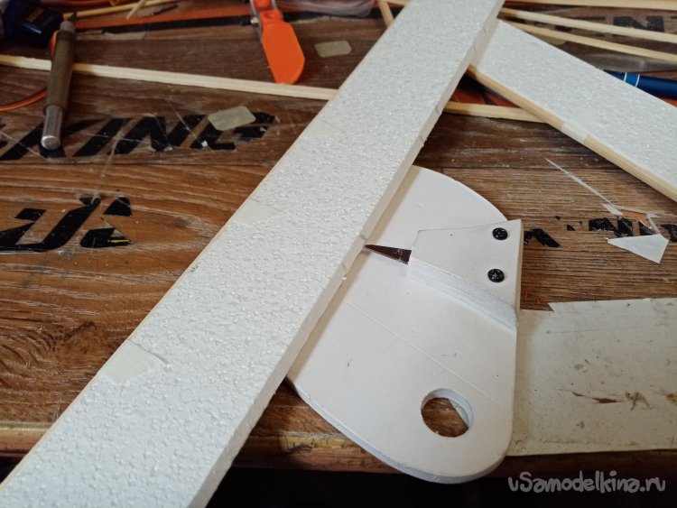 Пришел черед установки сервоприводов. В нужных местах срезаю скотч самодельным приспособлением. Изготовленный из рекламной пленки и кусочка бритвенного лезвия. Такая конструкция позволяет прорезать только слой скотча, практически не повреждая пенопласт. Ну…..теоретически.
