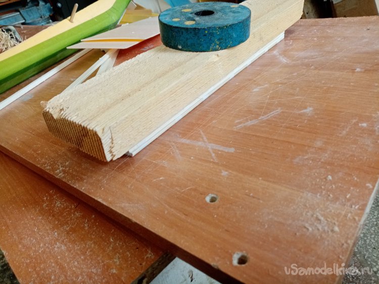 Следующим этапом, изготовление элеронов. Подбираю из коробочки заготовки нужного размера и толщины. Вырезаю детали. На приспособлении отрезаю одну кромку под углом в 45 градусов с двух сторон.