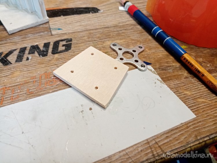 Выпиливаю деталь для крепления сервопривода из 4 мм шлифованной фанеры. Перед установкой на модель проверяю габаритные размеры. При помощи контрольного сервопривода. Срезаю скотч в месте установки рамки. Поскольку к нему плохо клеится даже термопистолет. Приклеиваю рамку.