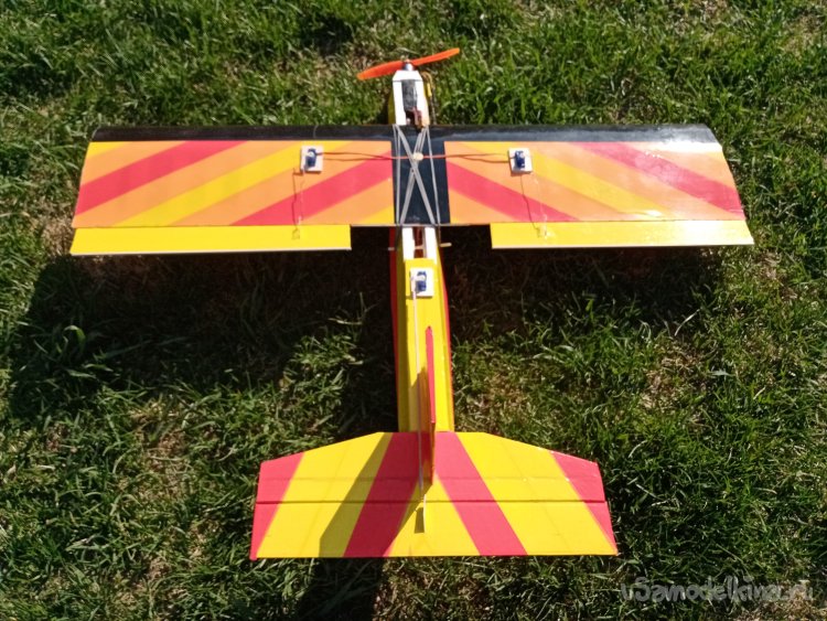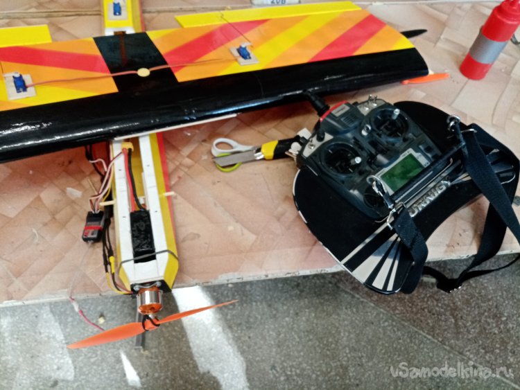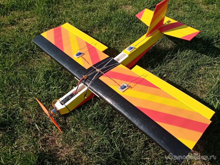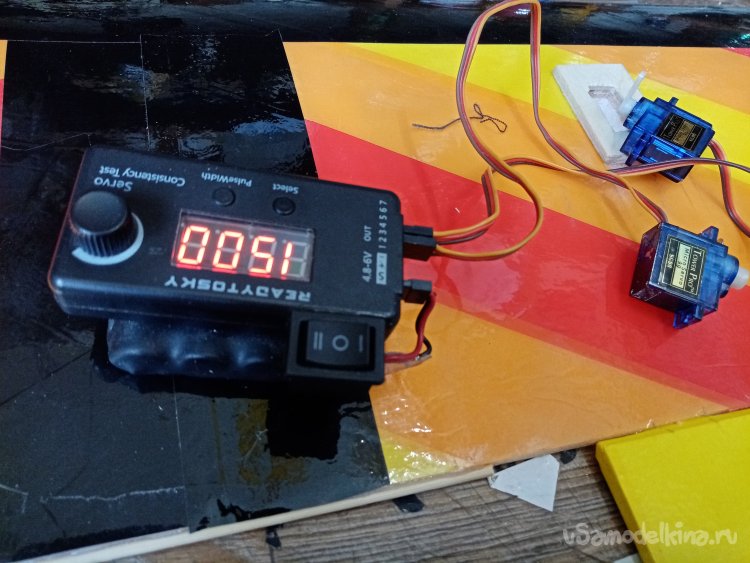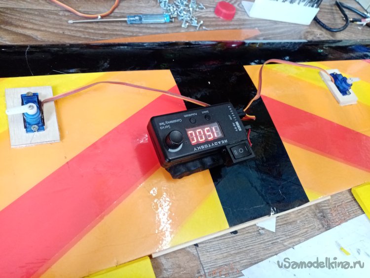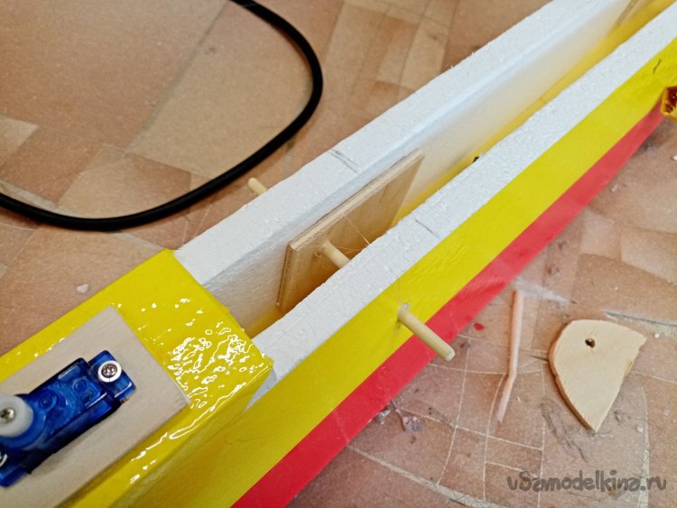 Приклеиваю на термоклей рамку крепления сервотестера. Прорезаю отверстие и устанавливаю сервоприводы, причем провода управления идут по верхней части крыла. Такое расположение предохраняет от повреждений при грубых посадках. Проверяю работоспособность сервоприводов. Прорезаю отверстия и устанавливаю кабанчики управления.