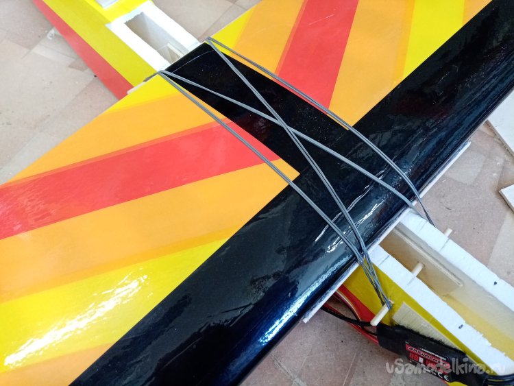 Сервоприводы установлены. При помощи металлической трубки прорезаю отверстие в средней части крыла. Провода от сервоприводов провожу на нижнюю поверхность и соединяю с разветвителем.