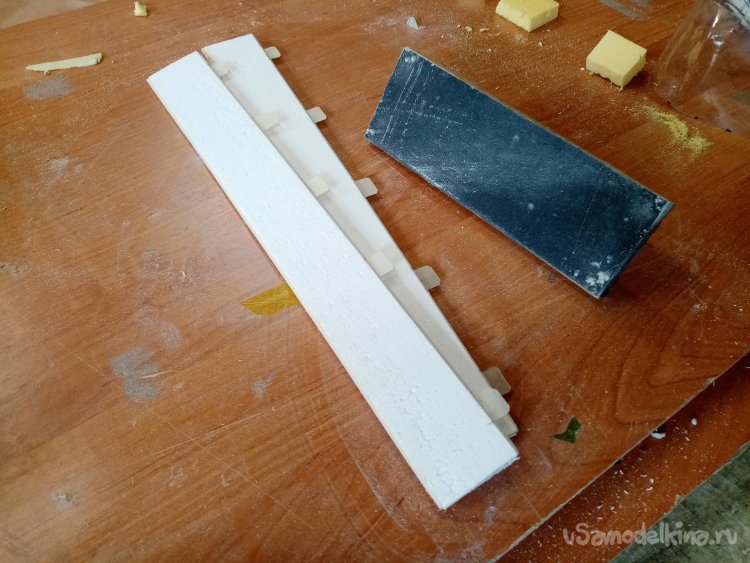 Кусочек пластика притираю крупной шкуркой с двух сторон. Придавая ей «лохматость», для лучшей адгезии клея. Затем размечаю карандашом на заготовки.
