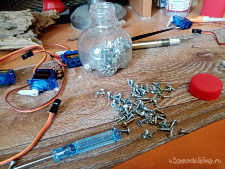 Вырезаю отверстие под сервопривод треугольным ножом для творчества. Подбираю нужный размер болтиков. Нужный диаметр сверла. Устанавливаю сервопривод на рамку из фанеры.