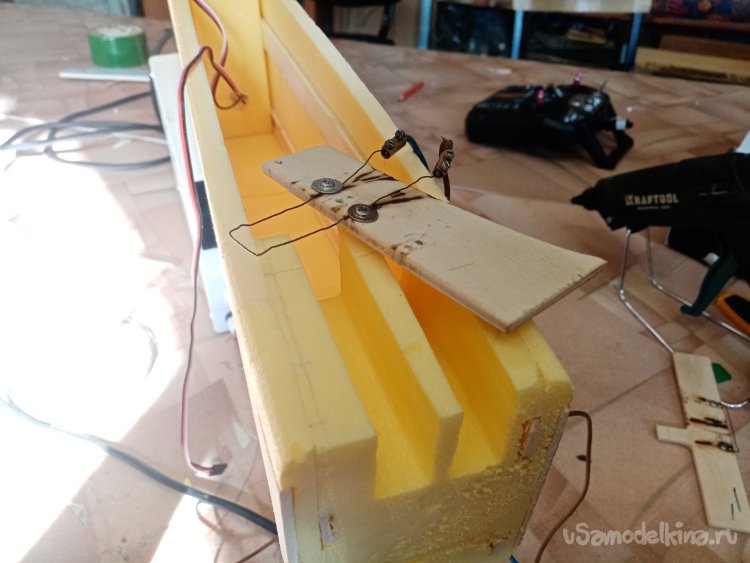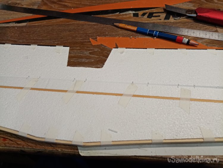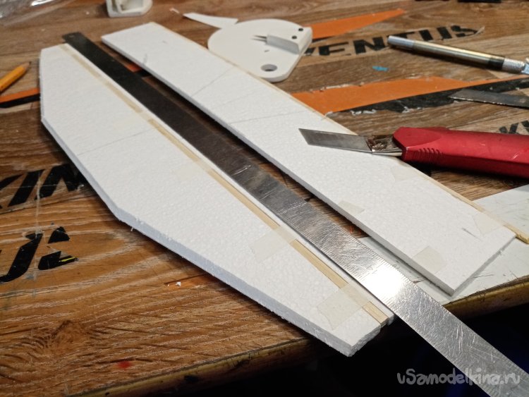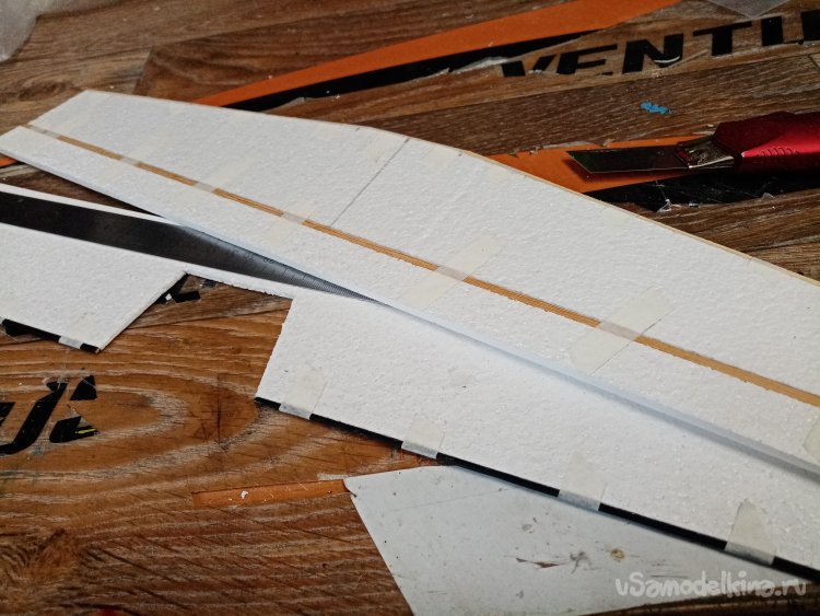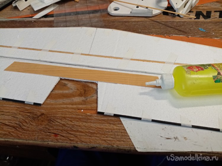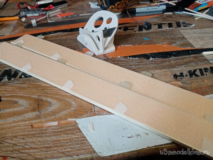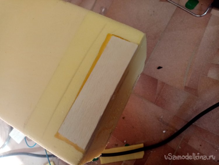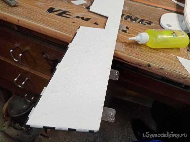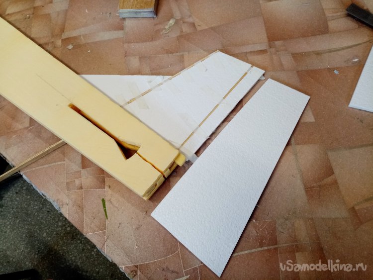 Из подложки под ламинат вырезаю заготовки. Элероны склеил из двух слоев. Сразу вклеиваю петли навески из пластика и усиление на заднюю кромку из палочек. Заготовки помещаю под пресс. С элеронами пока все.