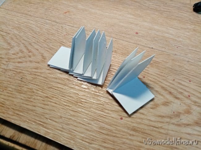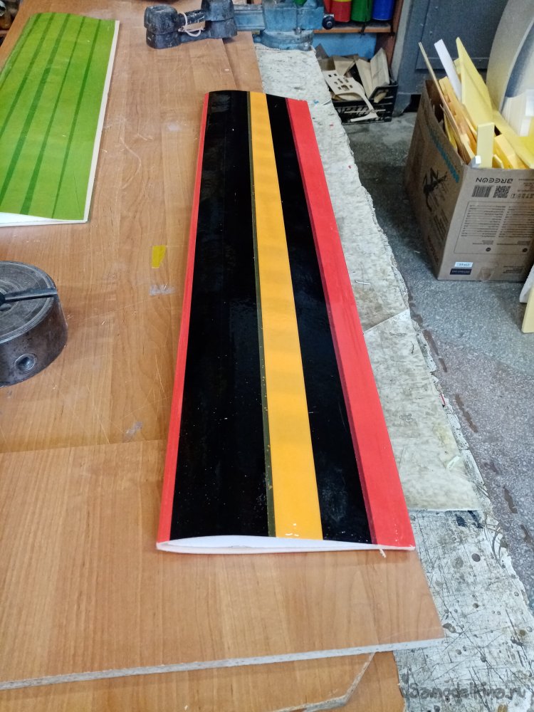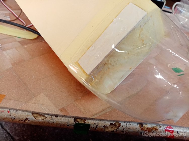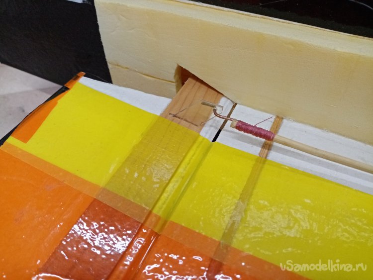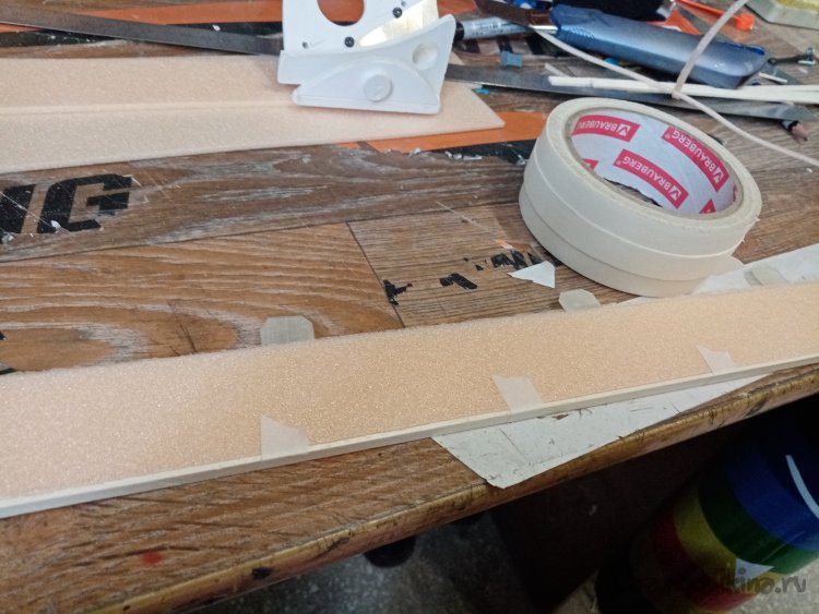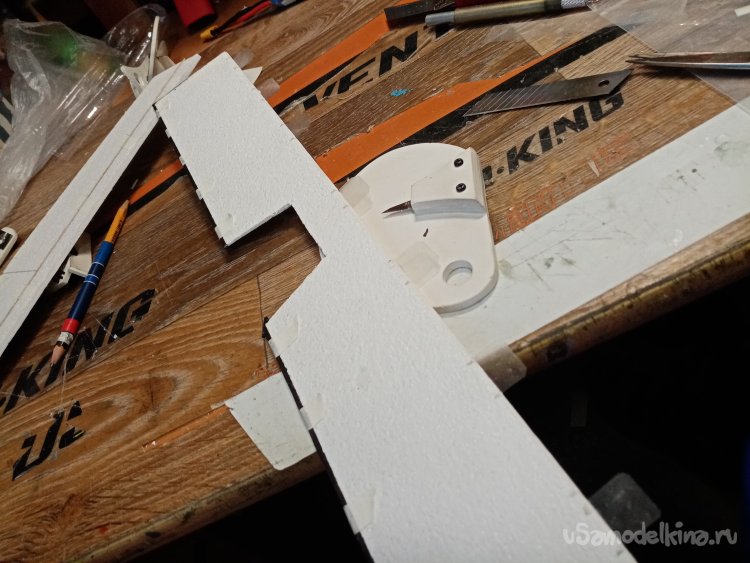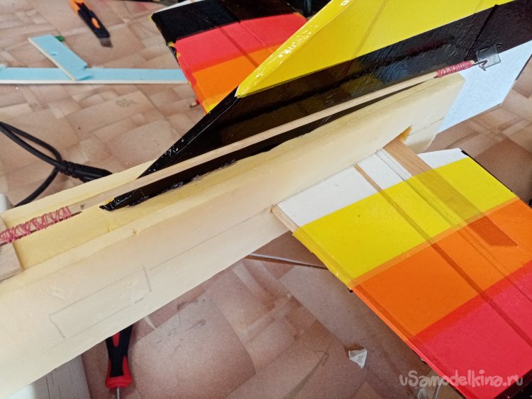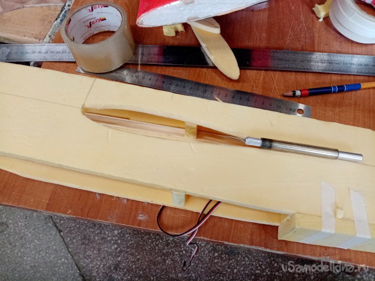 Из подложки под ламинат вырезаю заготовки. Элероны склеил из двух слоев. Сразу вклеиваю петли навески из пластика и усиление на заднюю кромку из палочек. Заготовки помещаю под пресс. С элеронами пока все.