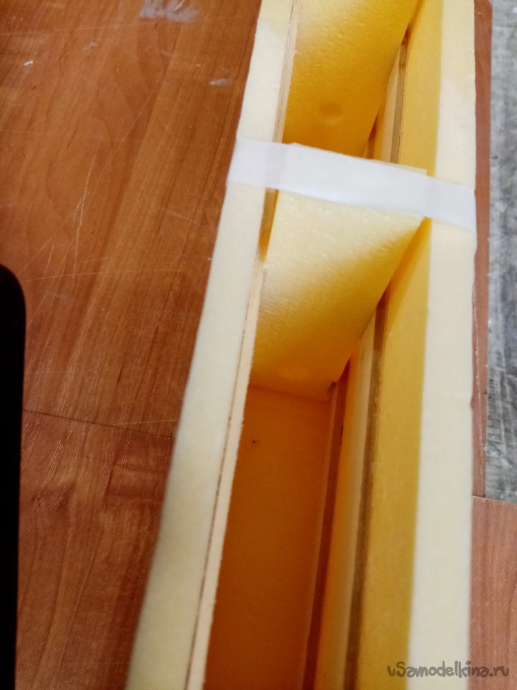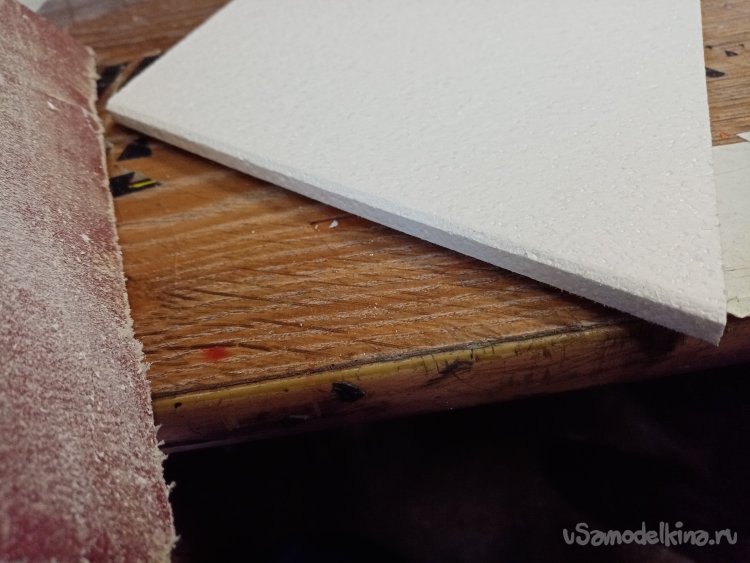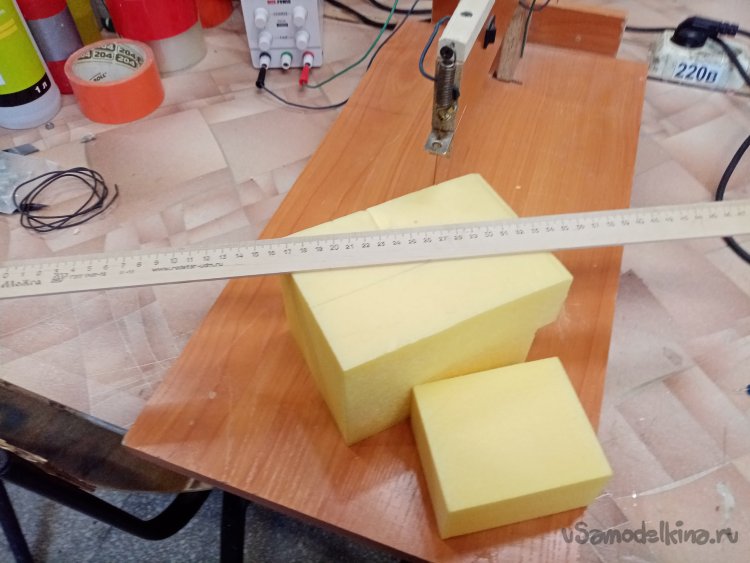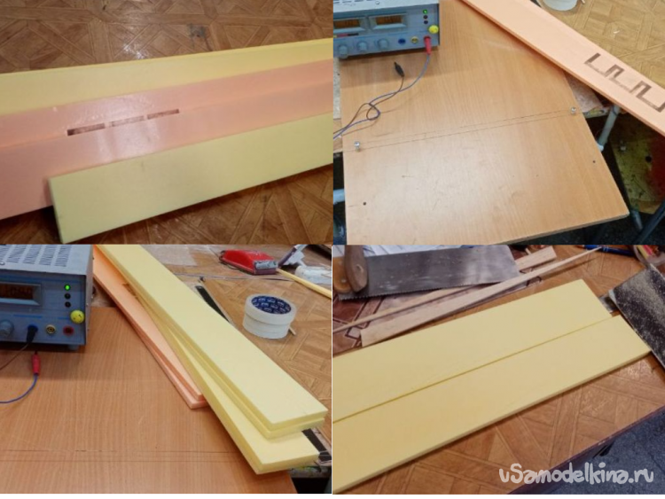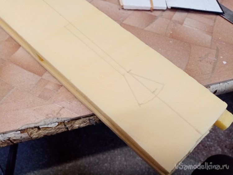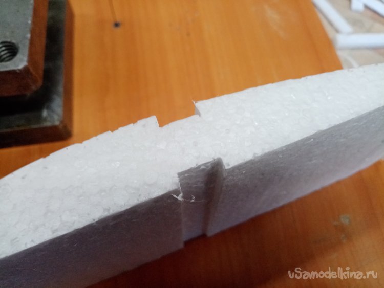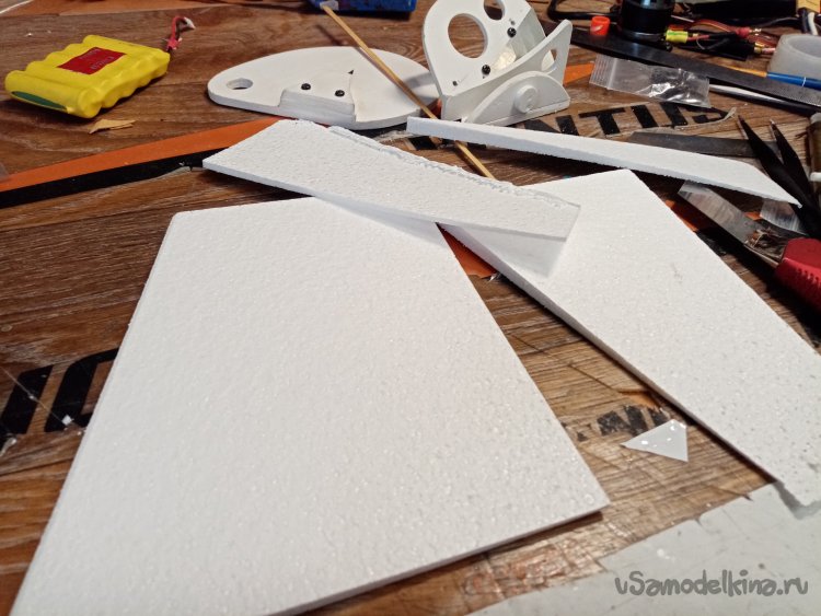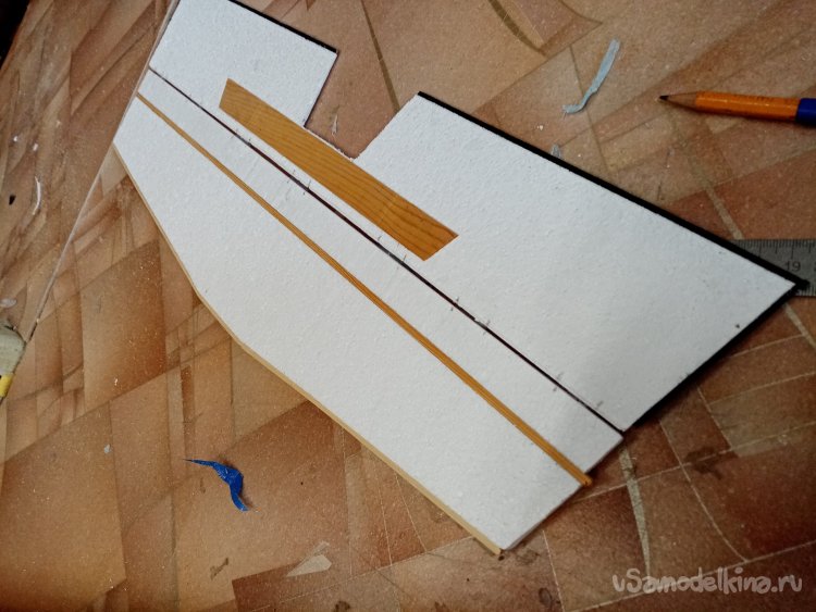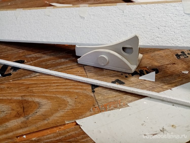 С крылом пока все, перехожу к изготовлению фюзеляжа. В качестве заготовок для бортов и днища нарезаю платин из обрезков утеплителя. В бой вступает горизонтальная резка.