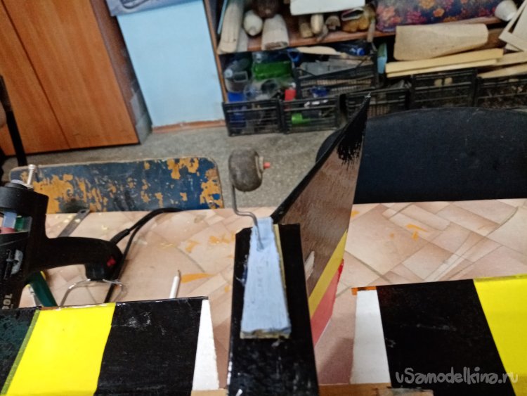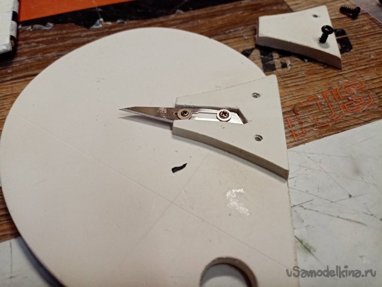 Отрезаю подвижную часть руля высоты. При помощи самодельного приспособления стачиваю кромку под углом в 45 градусов.
