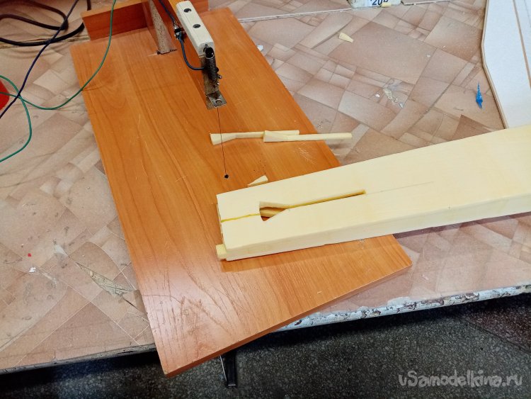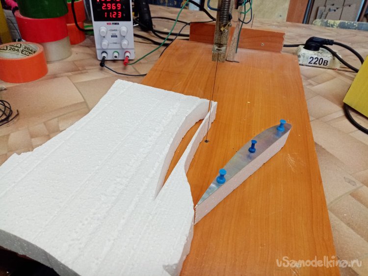 Включаю напряжение на нихромовую струну и процесс пошел. Шаблон закрепляю на пенопласте при помощи канцелярских булавок.