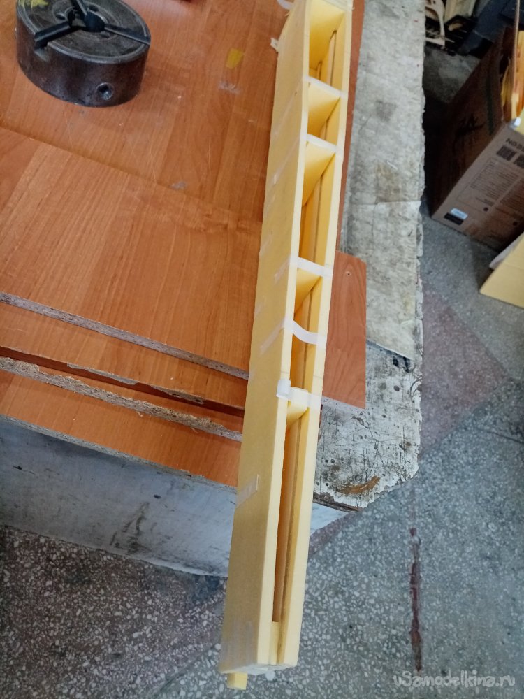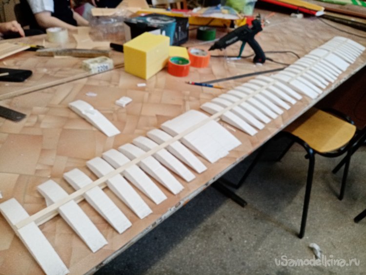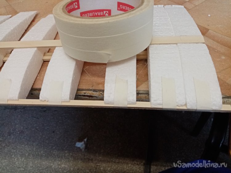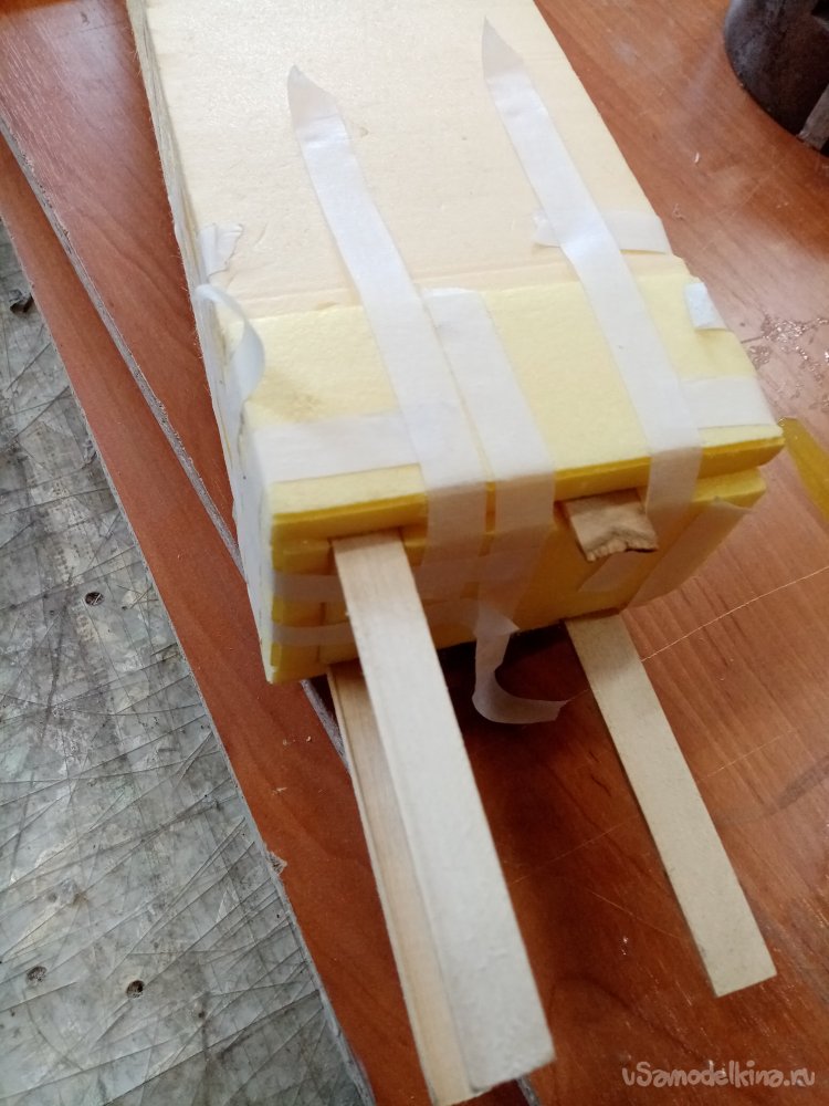 Напилил еще немного реек усиления бортов фюзеляжа. Вырезаю все части конструкции из нарезанных пластин утеплителя. Приклеиваю рейки усиления и днище. Не забываю переборки. Конструкцию собираю на термопистолете.