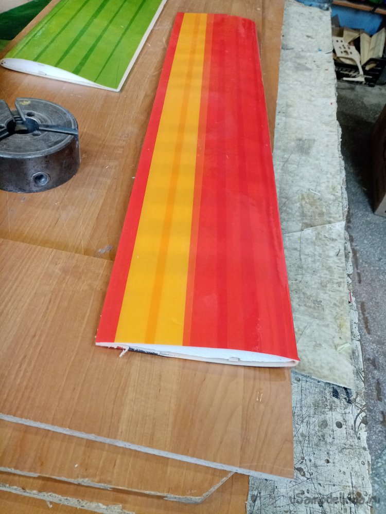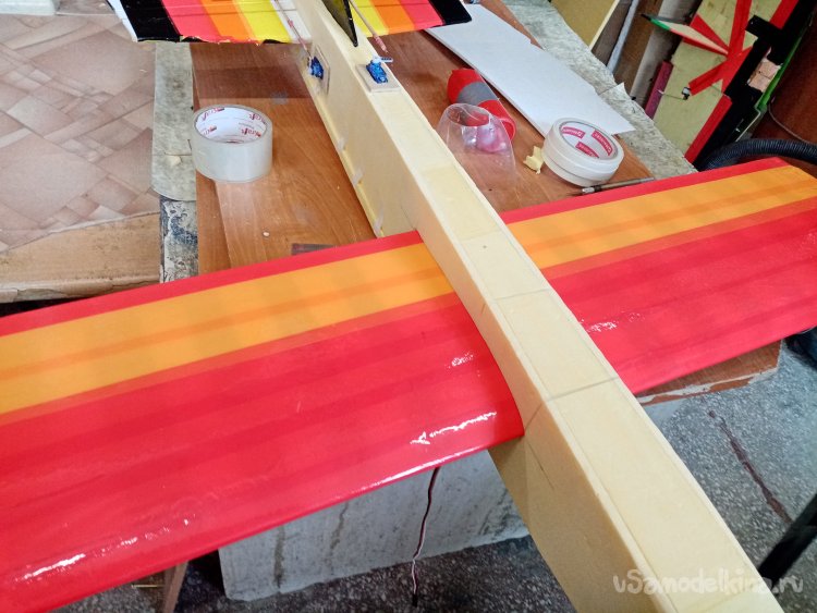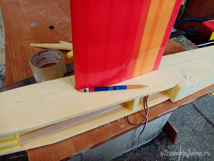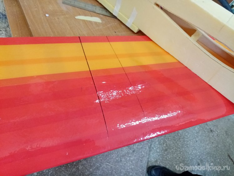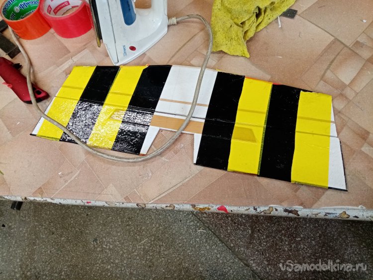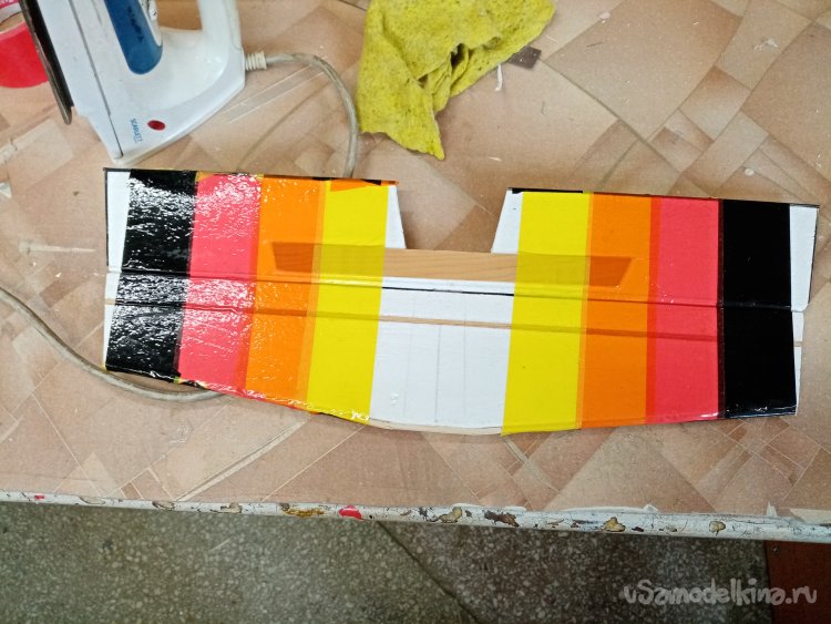 После высыхания крыла оклеиваю вес. Поверхность скотчем различных цветов. Это значительно увеличит прочность крыла. Привариваю скотч к пенопласту простым утюгом, отрегулировав температуру.
