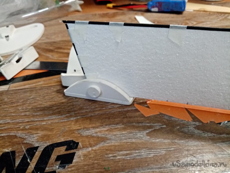 Вклеиваю петли в подвижную часть руля высоты. Подождав пока клей схватится, вклеиваю петли на место.