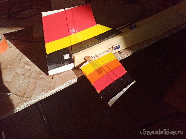 В кормовой части фюзеляжа размечаю положение элементов. Прорезаю отверстие под руль высоты и руль направления. Примеряю детали. Но перед установкой нужно оклеить детали цветной пленкой для красоты и прочности.