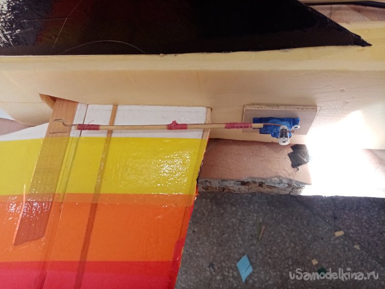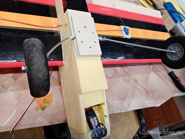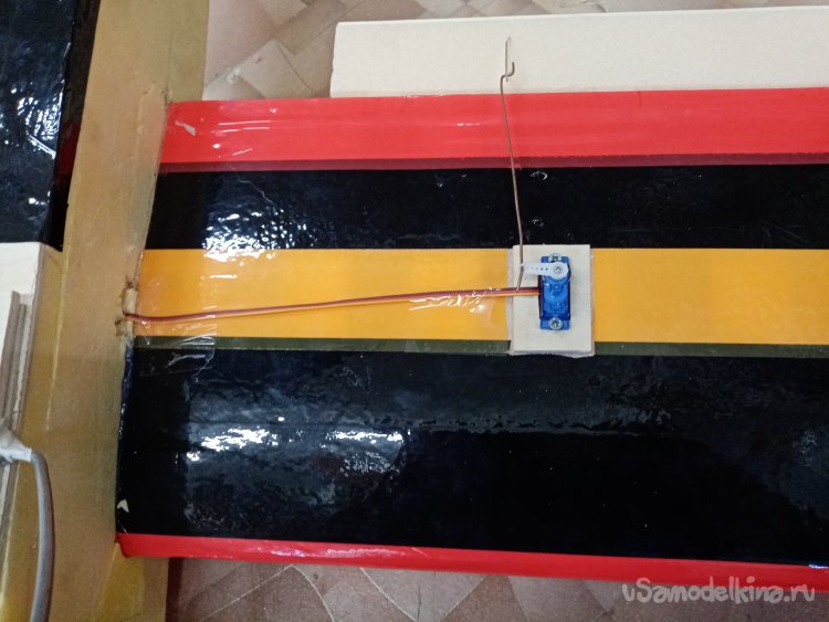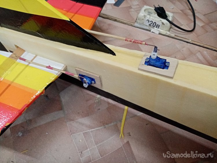 Устанавливаю силовую составляющую на модель, провожу управление. Устанавливаю сервоприводы на крылья, монтирую тяги.