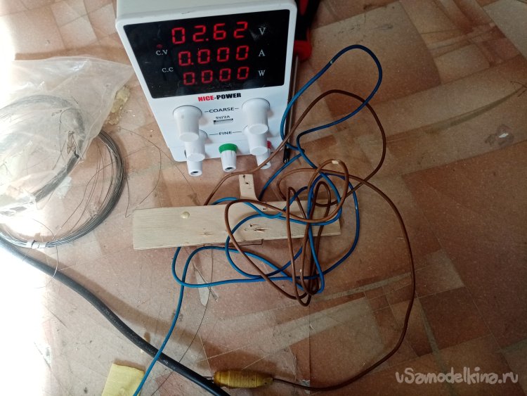 При помощи нихромовой струны вырезаю в бортах углубления для фанерок крепления капота. Заодно отверстия охлаждения регулятора и мотора в носике.