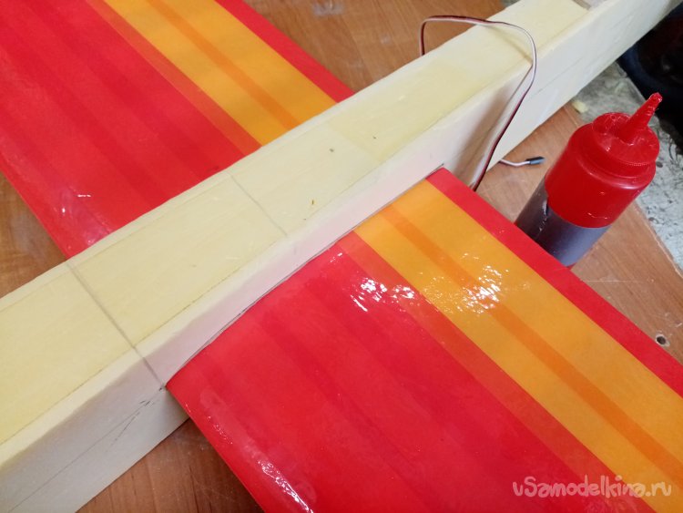 Наношу клей на верхнюю часть обшивки и набора закрываю крыло и придавливаю грузами. Полностью все заклеится только через двое суток. Поскольку клей плохо сохнет в закрытом объеме.