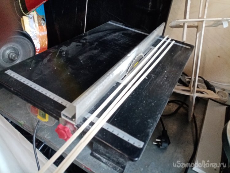 На маленькой пиле изготовил достаточное количество реек на лонжероны. Сечением 4х10мм, переднюю кромку 5х5мм. Очень хорошую пилку купили. Рез получается практически идеальный. Даже шкуркой не нужно поправлять.
