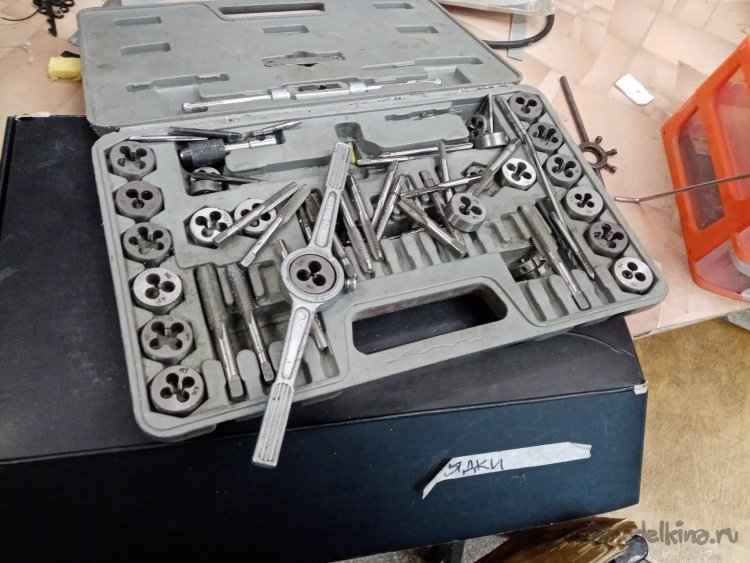 Достаю заветный чемоданчик с плашками и метчиками. Нарезаю резьбу на кончиках. Колеса закрепляю на болтиках с фиксаторами.