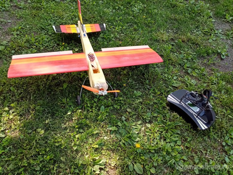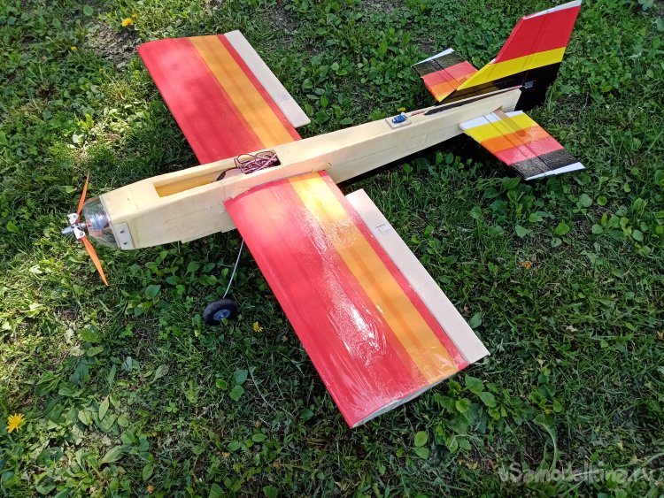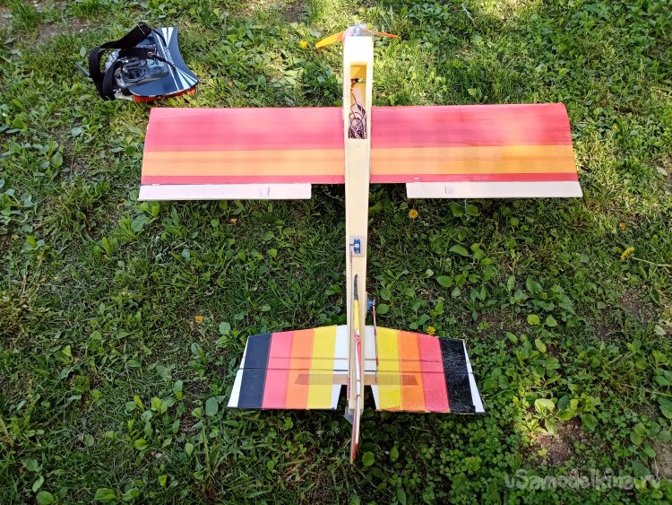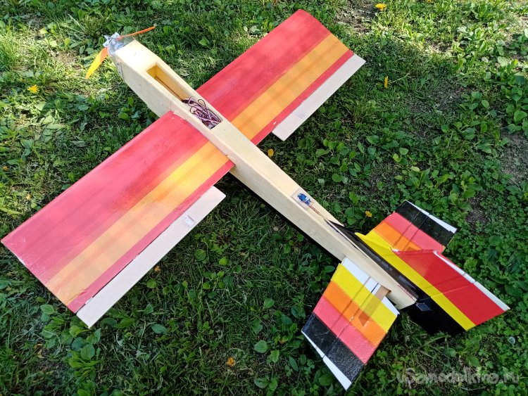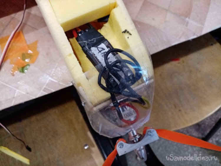 После установки сервоприводов в хвостовой части нужно определить центр тяжести фюзеляжа. В носовой части устанавливаю мотор с винтом, регулятор и аккумулятор. Эти части просто закрепляю на малярный скотч. После размещения всех элементов определяю центр тяжести. Крыло располагаю исходя из одной трети от носика.