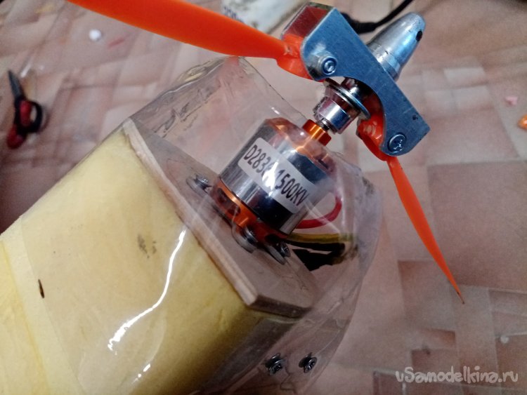 На торец приклеиваю мотораму из 4 мм шлифованной фанеры, размечаю положение двигателя. На пузико фанеру крепления шасси.