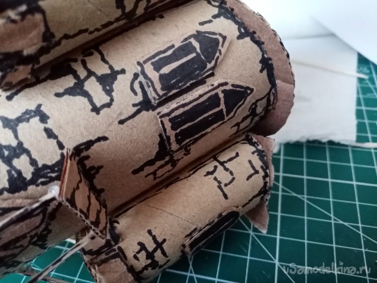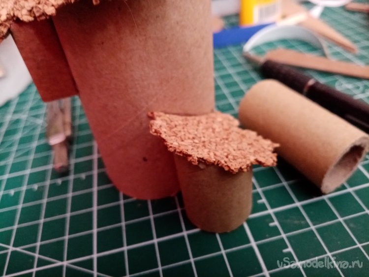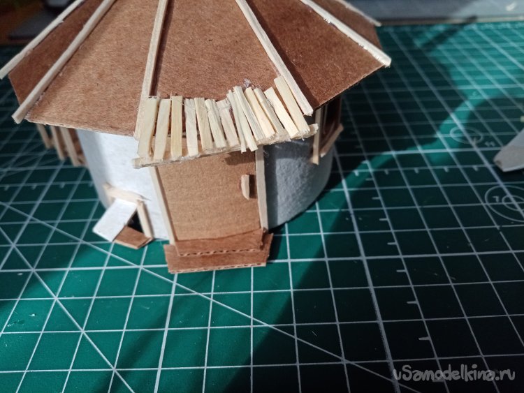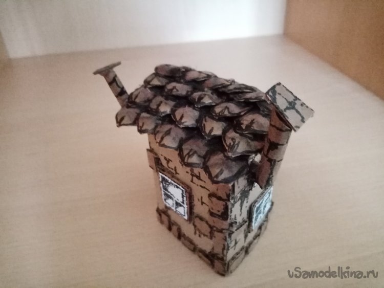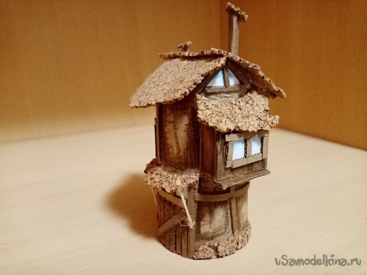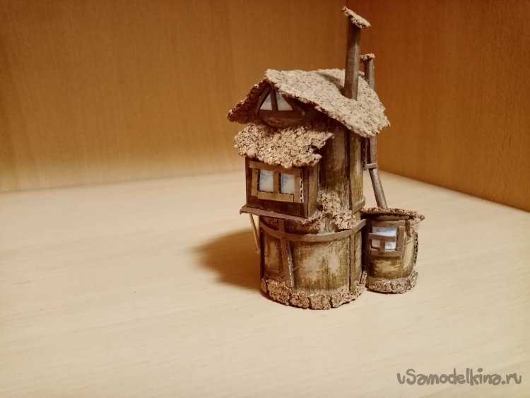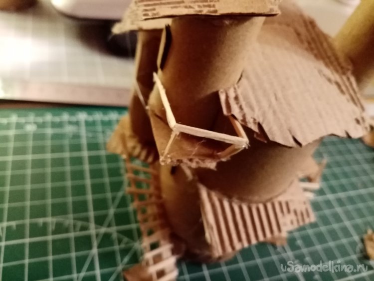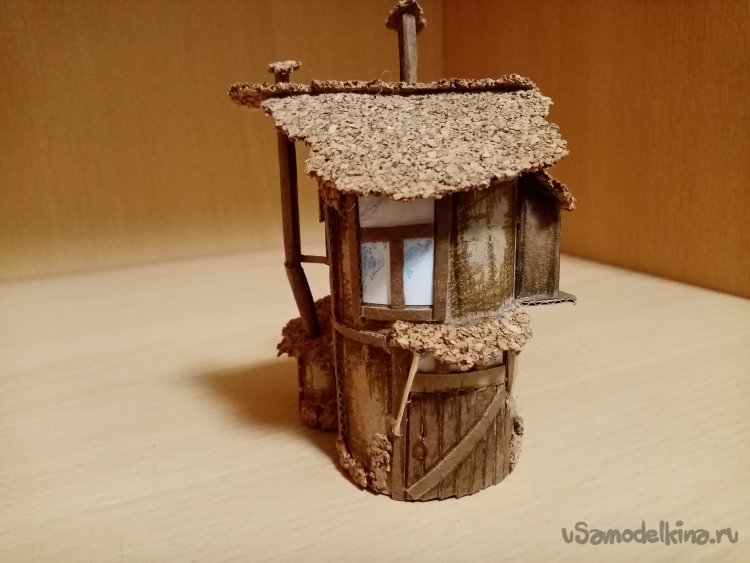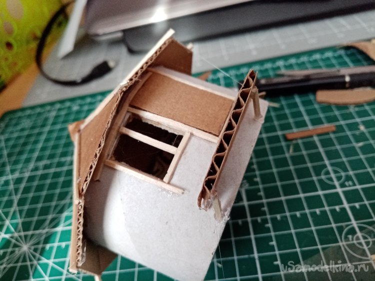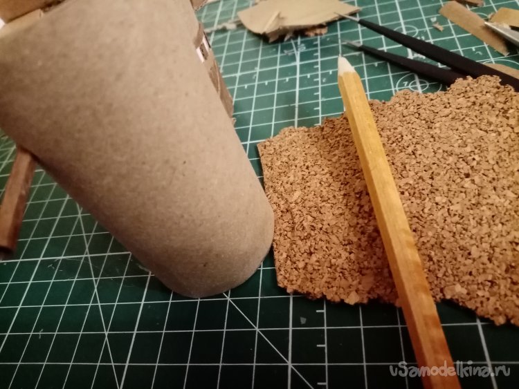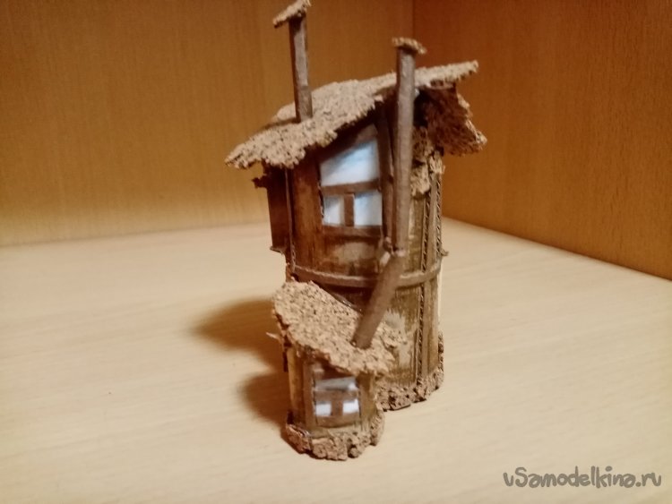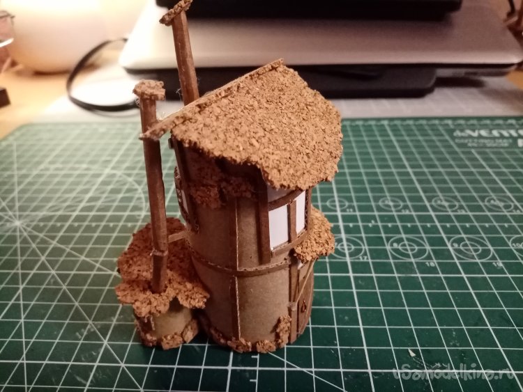 Бодро склеиваю еще одно строение с закрытым балконом, пристройкой и печными трубами. Все эти дела накрываю кусочками прессованной пробочной панели.