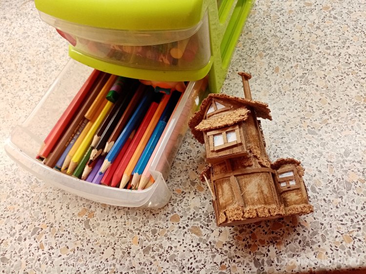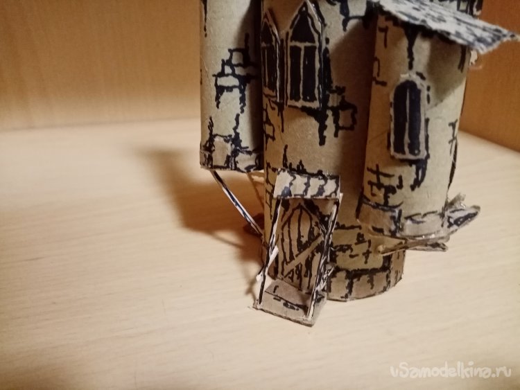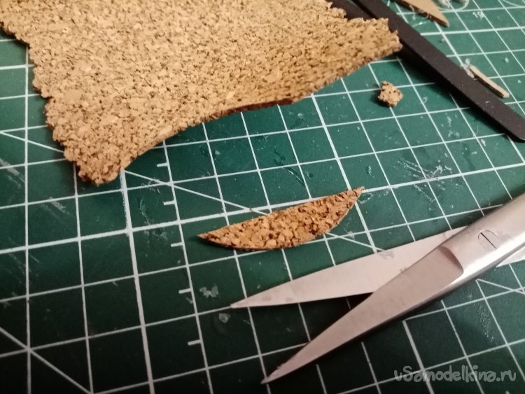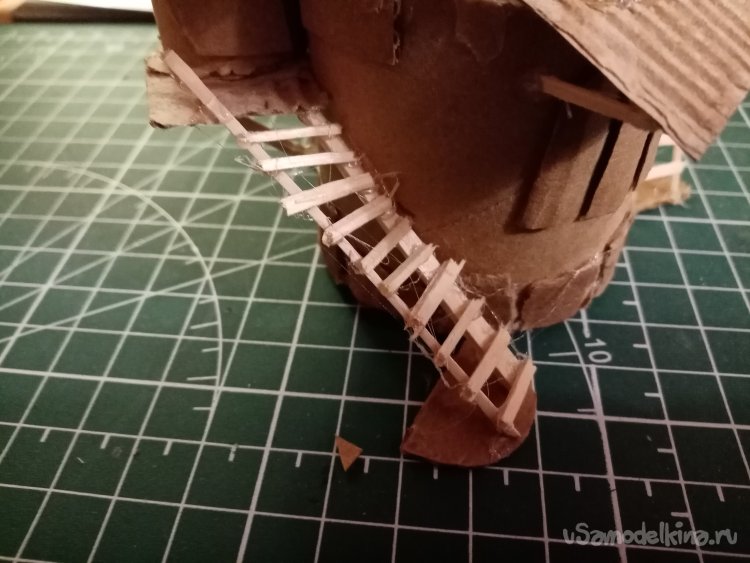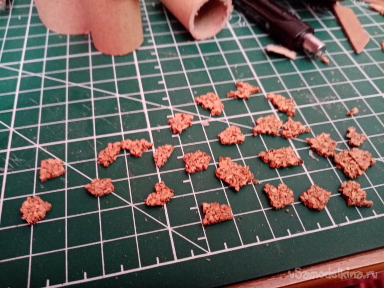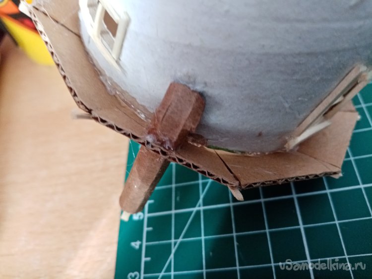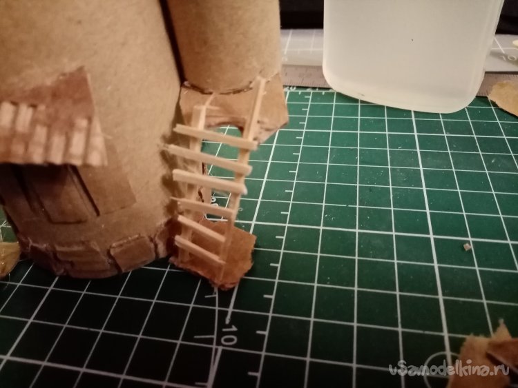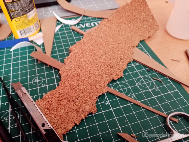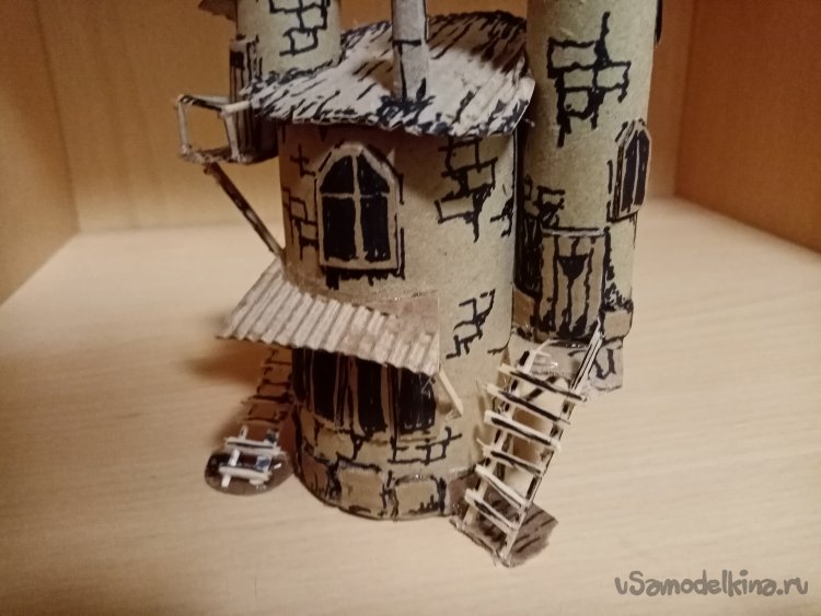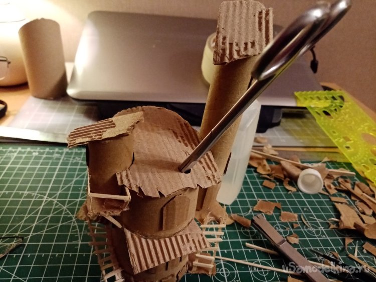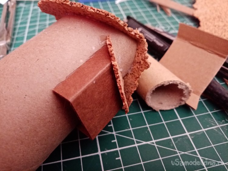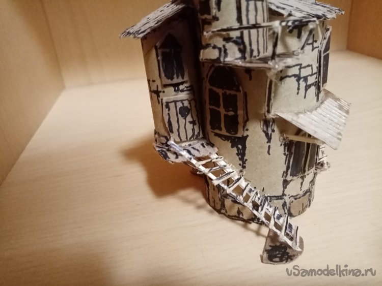 Бодро склеиваю еще одно строение с закрытым балконом, пристройкой и печными трубами. Все эти дела накрываю кусочками прессованной пробочной панели.