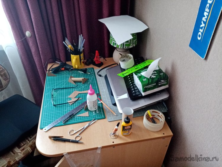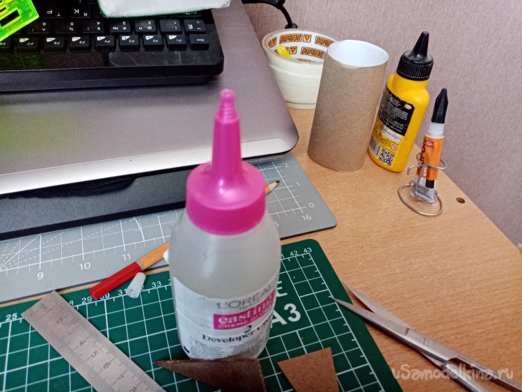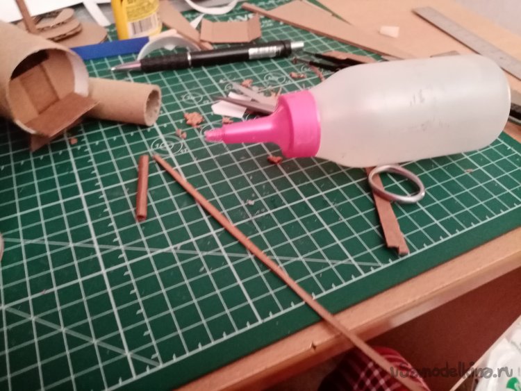 Сминаю края картонки, вырезаю заготовки на покрышку. Парочку деталей соединяю на любимый титан. Предварительно разлитый в маленькую бутылочку с тонким носиком. Для удобства пользования. В наличии еще есть черный фломастер и лист белой бумаги.