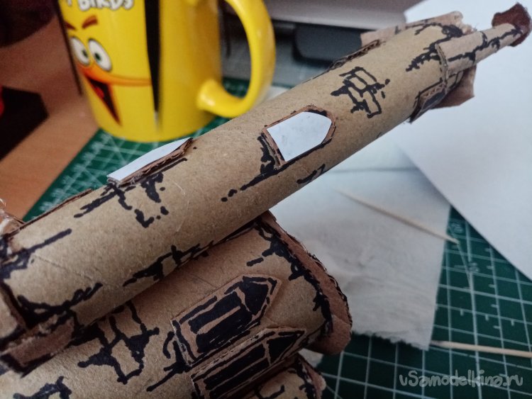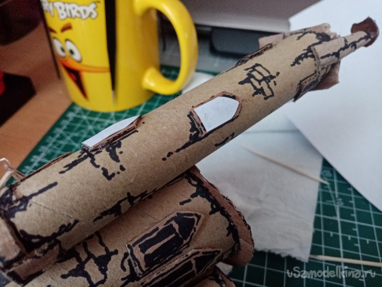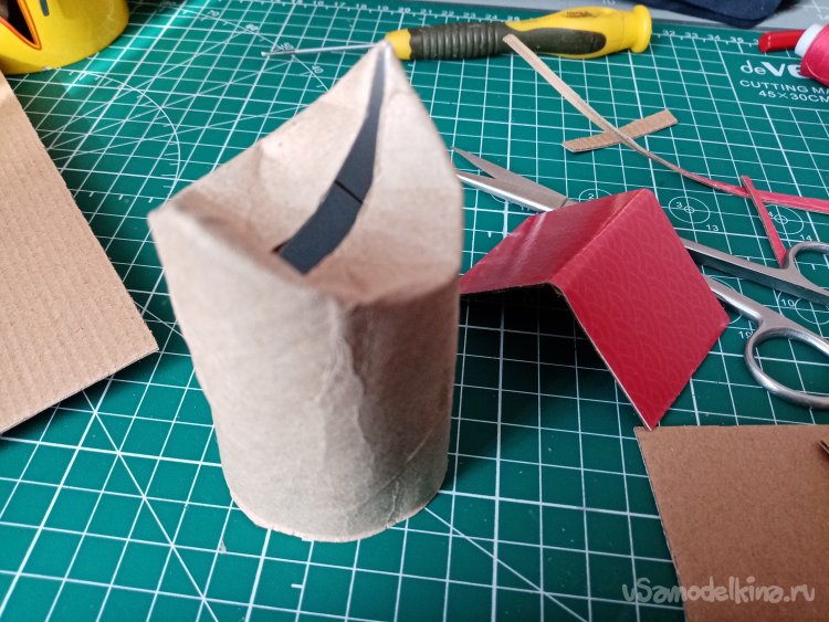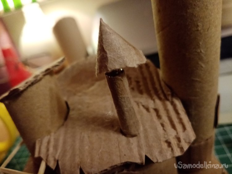 Картон пошел на небольшую трубу. Просто так не хочется её воткнуть в крышу, так уже делал. Решил вывести из стены. Сгибаю заготовку в колено и приклеиваю на место.