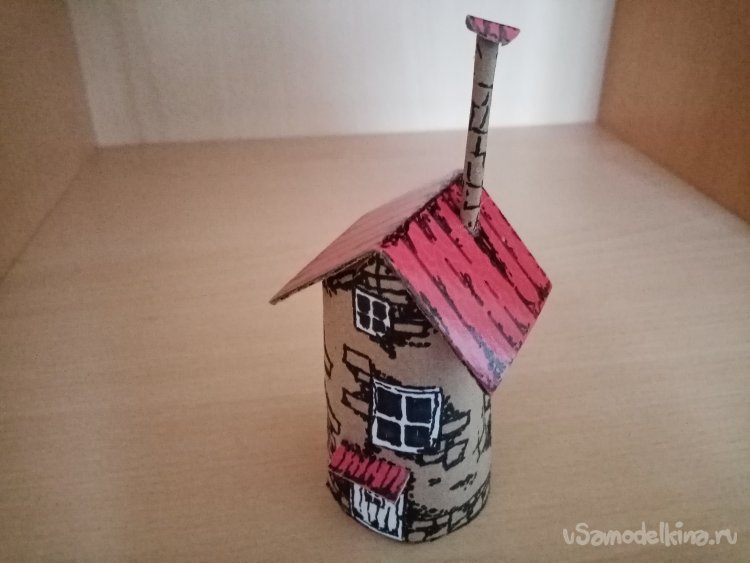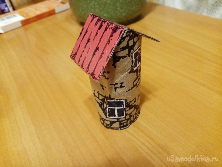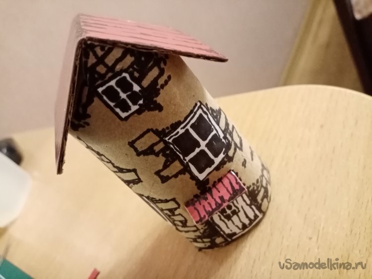 Из красного картона изготовил крышу, из белой бумаги окна. Немного расписал фломастером. Получился домик.
