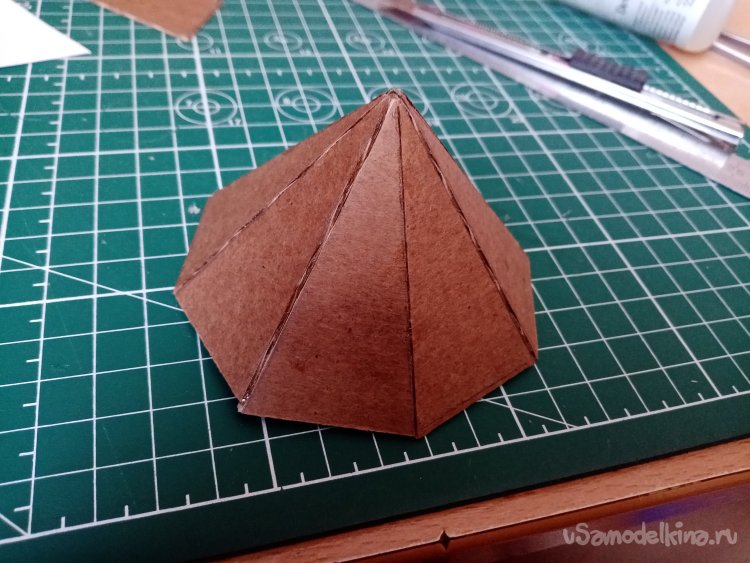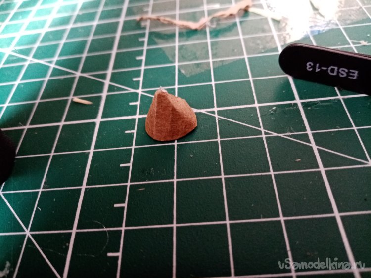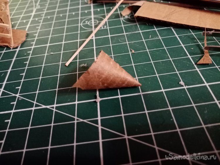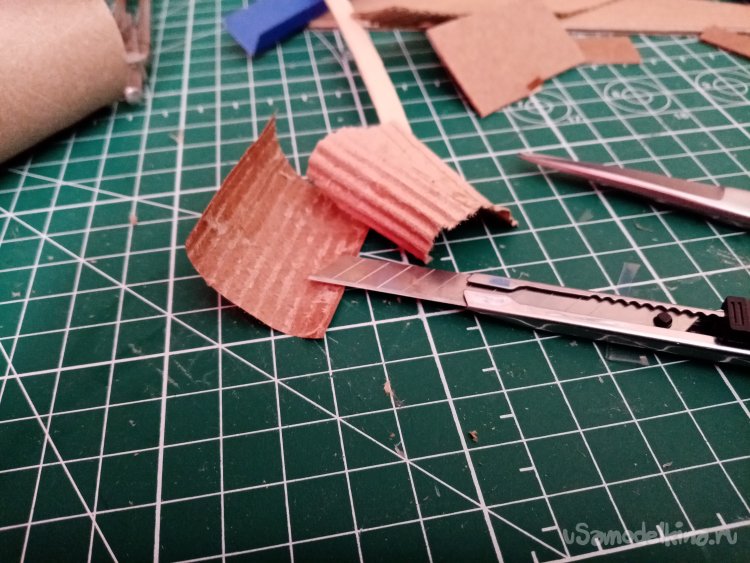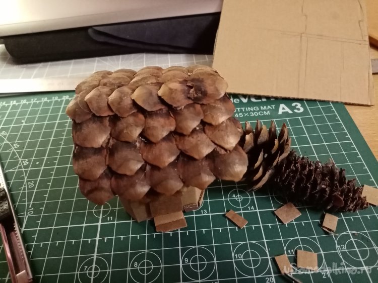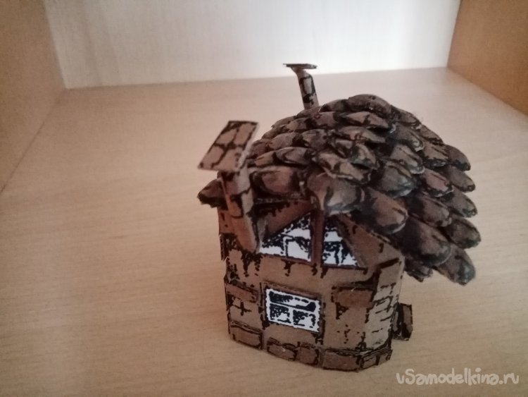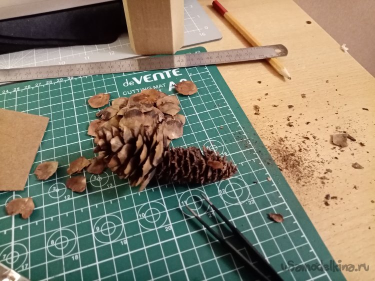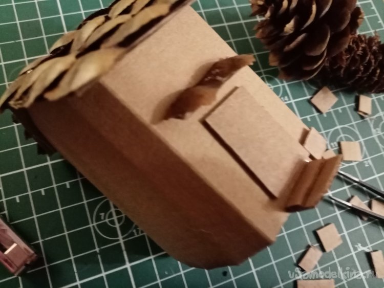 Вырезал и склеил стены. Нужна крыша. Кусочек картона помету вырезаю. Настал черед шишки. Разбираю её на запчасти