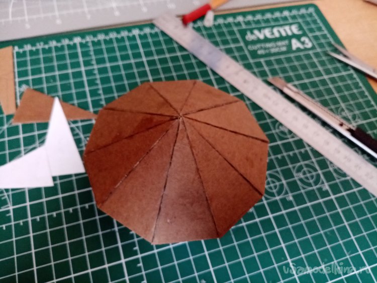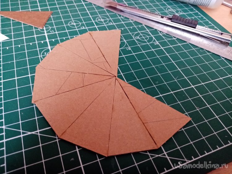 Попалась картонная трубка от малярного скотча. Довольно большого диаметра. Сделаю круглое. Для начала шаблон раскроя крыши. Изготовил из бумаги. Затем вырезал из картона. Склеивать заготовки буллу титаном. Есть тонкость. Если нанести на заготовку титан и выждать минут пять, для загустевания клея, то все соединяется сразу. Как на циакрине. Поэтому так и делаю, клей на ребра крыши нанес и выжидаю время.
