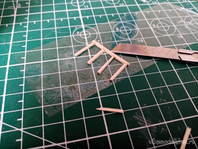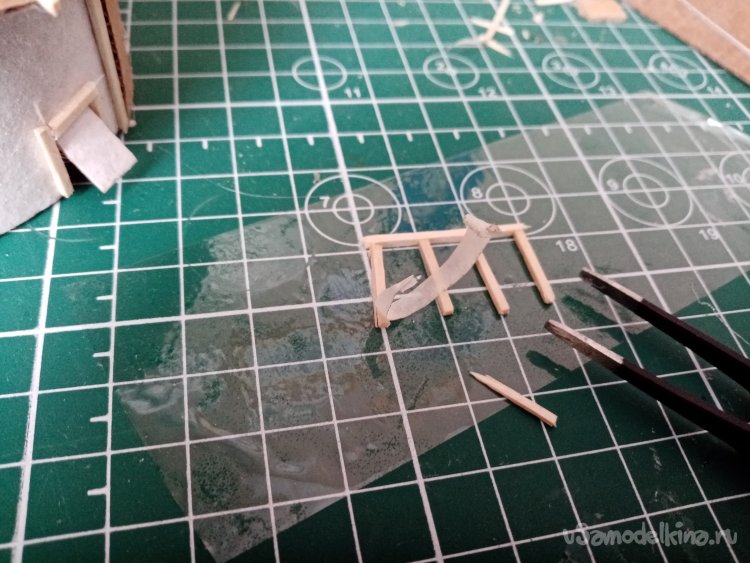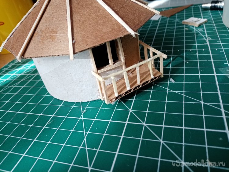 Из таких же палочек склеиваю перила на маленький балкончик. Сначала приклеиваю скотч на место, для защиты от клея, затем собираю детальку. Когда клей высыхает, отделяю готовое изделие и монтирую на место.