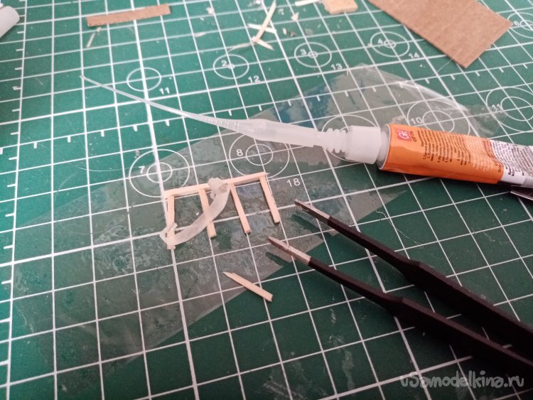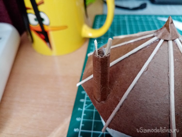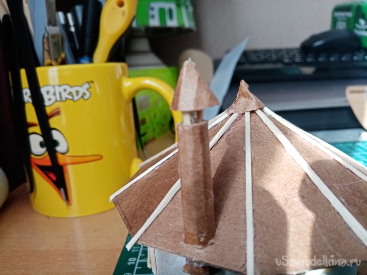 Разрезаю палочку от мороженого вдоль и приклеиваю на ребра крыши.